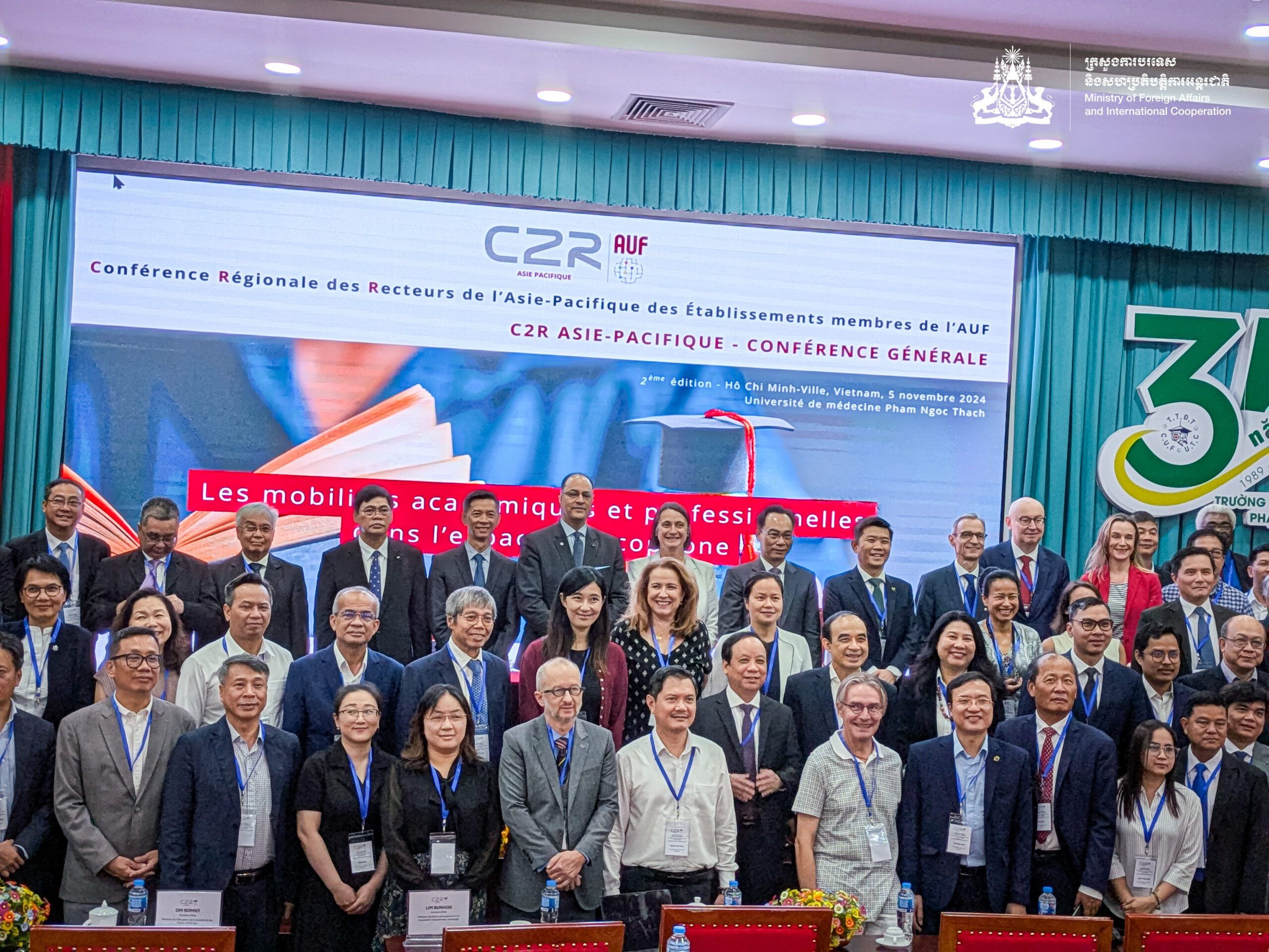 (ភ្នំពេញ)៖ ឯកឧត្តម លីម ប៊ុនហុក រដ្ឋលេខាធិការ ក្រសួងការបរទេស និងសហប្រតិបត្តិការអន្តរជាតិ ជាអ្នកសម្របសម្រួលជាតិកម្ពុជា អមអង្គការអន្តរជាតិហ្រ្វង់កូហ្វូនី និងជាតំណាងរបស់ ឯកឧត្តមឧបនាយករដ្ឋមន្ត្រី សុខ ចិន្តាសោភា រដ្ឋមន្ត្រីការបរទេស និងសហប្រតិបត្តិការអន្តរជាតិ នៅថ្ងៃទី៥ ខែវិច្ឆិកា ឆ្នាំ២០២៤ បានអញ្ជើញចូលរួម ក្នុងសន្និសីទថ្នាក់តំបន់លើកទី២ នៃសាកលវិទ្យាធិការគ្រឹះស្ថានឧត្តមសិក្សាជាសមាជិកទីភ្នាក់ឧត្តមសិក្សាប្រើប្រាស់ភាសាបារាំង ប្រចាំតំបន់អាស៊ី-ប៉ាស៊ីហ្វិក (C2R-AP) ដែលបានប្រព្រឹត្តទៅនៅសាកលវិទ្យាល័យវេជ្ជសាស្ត្រ Pham Ngoc Thach ទីក្រុងហូជីមិញ ប្រទេសវៀតណាម។