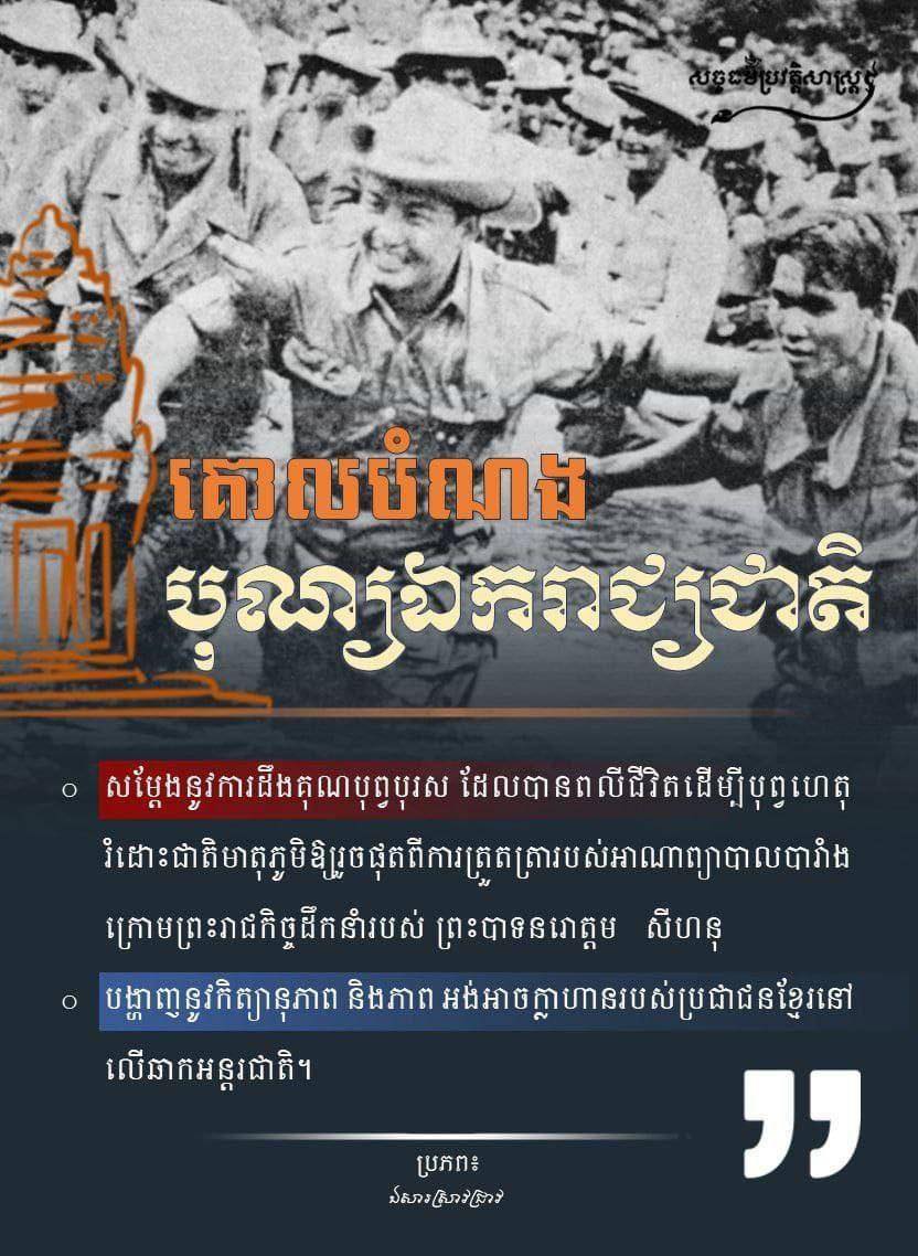 ៚ សម្ដែងនូវការដឹងគុណបុព្វបុរស ដែលបានពលីជីវិតដើម្បីបុព្វហេតុរំដោះជាតិមាតុភូមិឱ្យរួចផុតពីការត្រួតត្រារបស់អាណាព្យាបាលបារាំង ក្រោមព្រះរាជកិច្ចដឹកនាំរបស់ ព្រះបាទនរោត្ដម សីហនុ