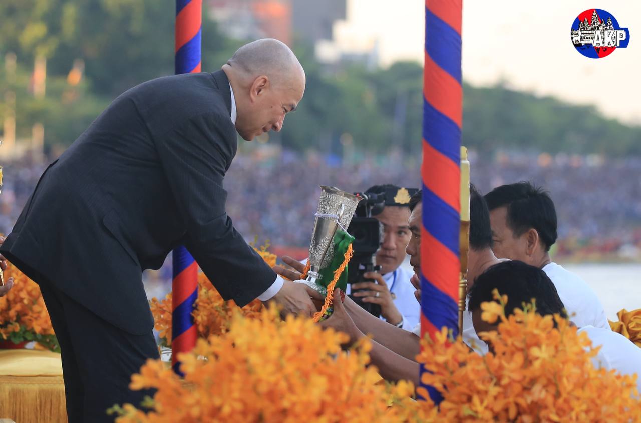 ព្រះករុណាព្រះមហាក្សត្រប្រទានរង្វាន់ដល់ទូកជ័យលាភីក្នុងថ្ងៃផ្តាច់ព្រ័ត្រនៃព្រះរាជពិធីបុណ្យអុំទូក