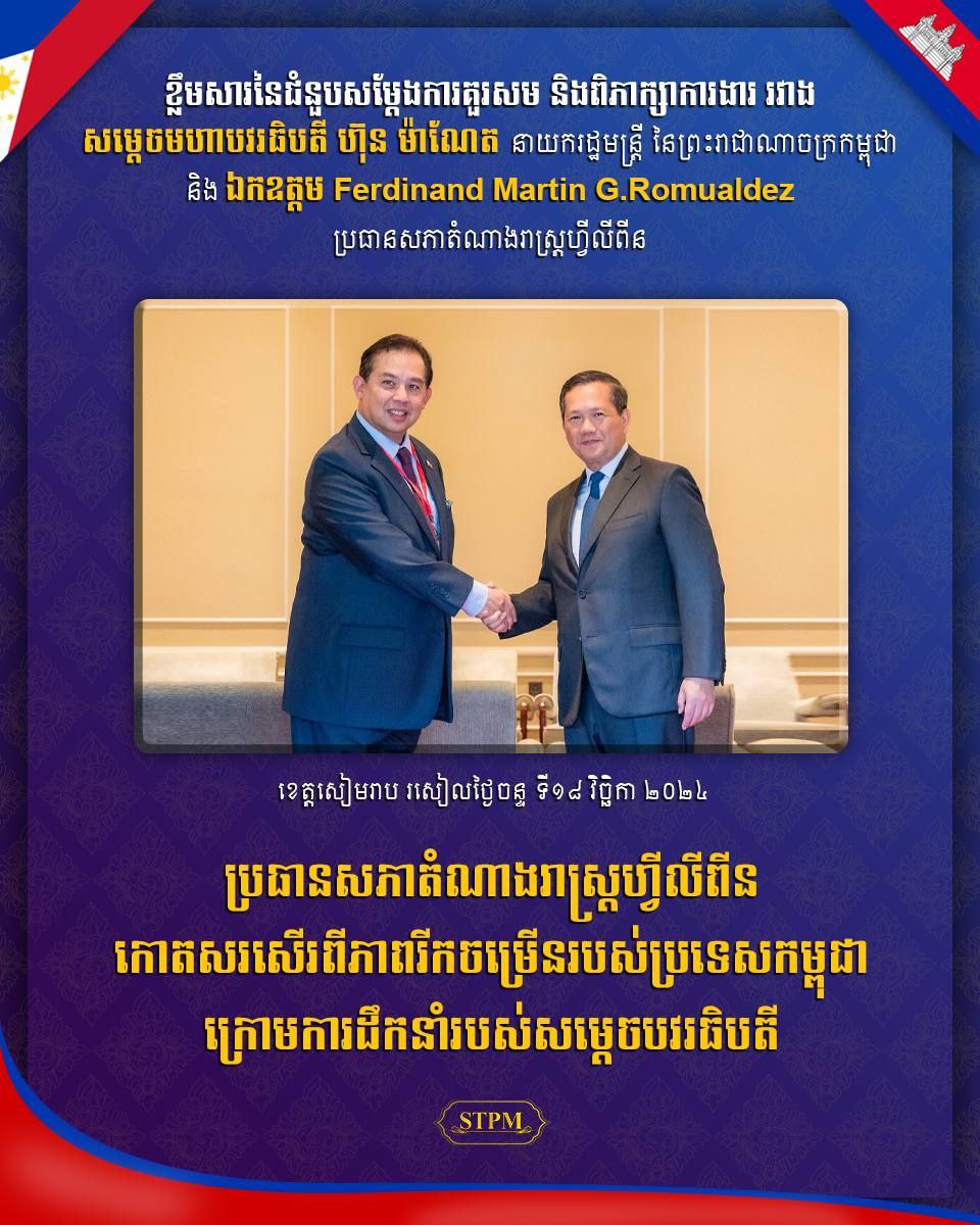 ក្នុងឱកាសនៃជំនួប ឯកឧត្តមប្រធានសភាតំណាងរាស្ត្រហ្វីលីពីន បានអបអរសាទរប្រទេសកម្ពុជា ដែលបានរៀបចំកិច្ចប្រជុំគណៈកម្មាធិការប្រតិបត្តិអ្នកប្រជាធិបតេយ្យនិយមកណ្តាលអន្តរជាតិ (CDI-IDC Executive Committee) បានយ៉ាងល្អប្រសើរ និងកោតសរសេីរភាពរីកចម្រើនរបស់កម្ពុជា ក្រោមការដឹកនាំរបស់សម្ដេចបវរធិបតី។