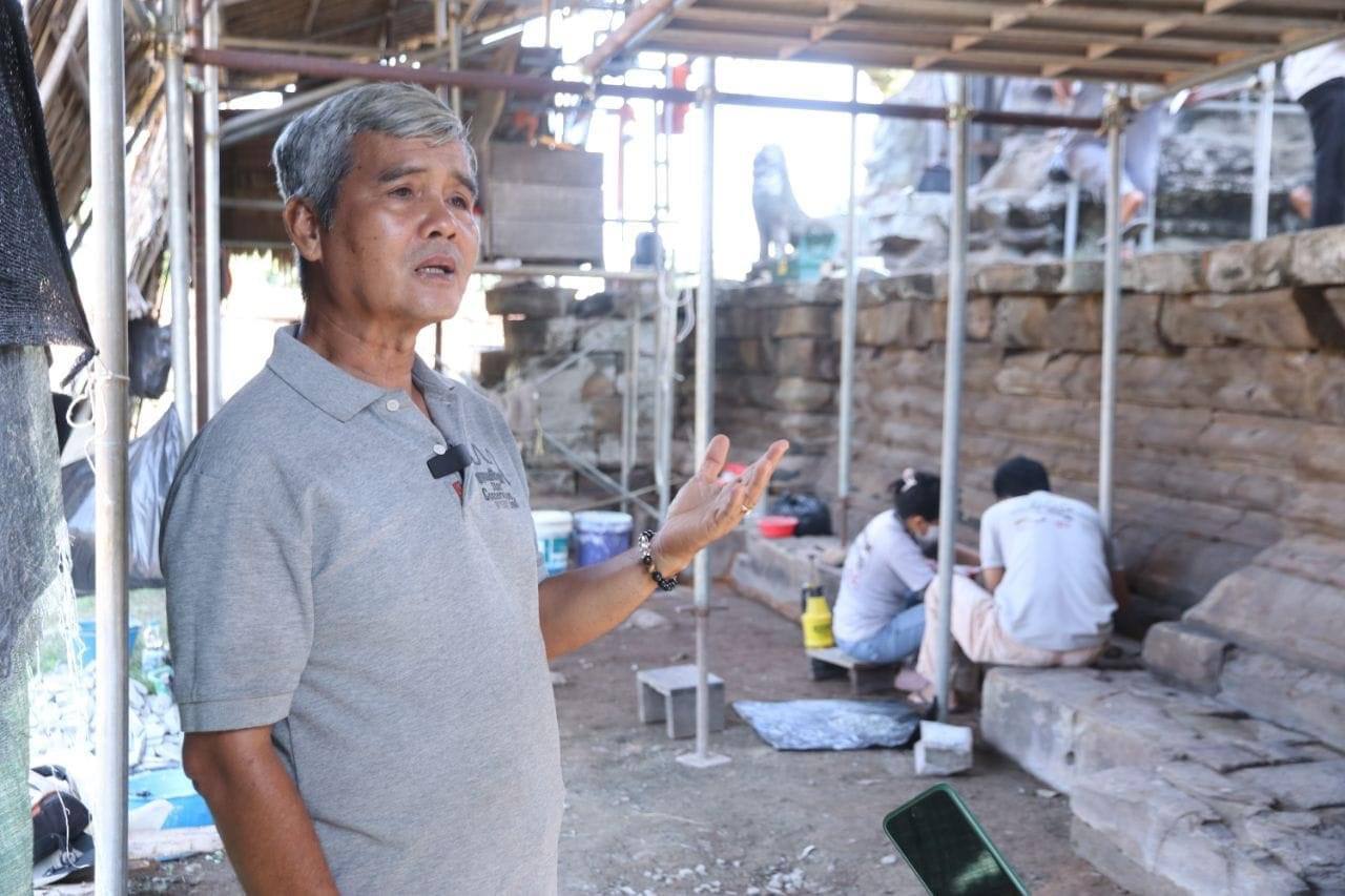 អ្នកជំនាញធ្វើការជួសជុលជណ្ដើរមុខនៅផ្នែកខាងលិច ឆៀងខាងជើង និងជួយសង្រ្គោះក្បាច់ចម្លាក់ដែលខូចខាតនៅប្រាសាទភ្នំក្រោម