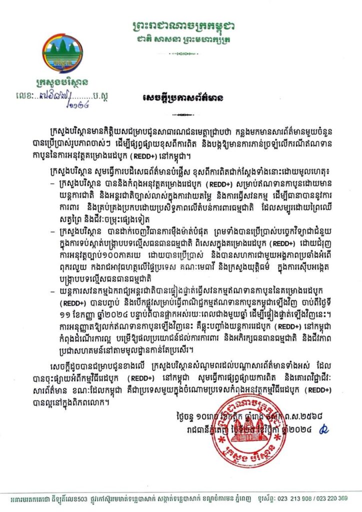 ក្នុងសេចក្តីប្រកាសព័ត៌មាននេះក្រសួងបរិស្ថានបានបញ្ជាក់ដោយបានធ្វើការបដិសេធថាការចុះផ្សាយតាមរូបភាពនេះគឺជាព័ត៌មានបំផ្លើស ខុសពីការពិតជាក់ស្តែងទាំងនោះដោយមូលហេតុ៖ ក្រសួងបរិស្ថាន បាននិងកំពុងអនុវត្តគម្រោងរេដបូក (REDD+) សម្រាប់ឥណទានកាបូនដោយមាន យន្តការជាតិ និងអន្តរជាតិច្បាស់លាស់ក្នុងការវាយតម្លៃ និងការធ្វើសវនកម្ម ដើម្បីធានាបាននូវការ ការពារ និងគ្រប់គ្រងប្រកបដោយប្រសិទ្ធភាពលើតំបន់ការពារធម្មជាតិ ដែលសម្បូរដោយព្រៃឈើ សត្វព្រៃ និងជីវៈចម្រុះផ្សេងទៀត ។