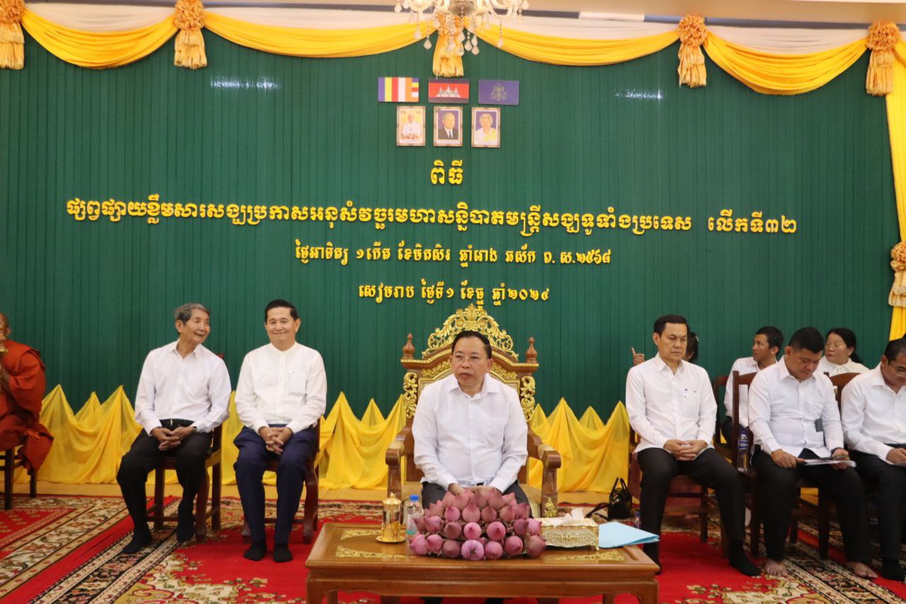 ក្នុងឱកាសសំណេះសំណាលនិងផ្សព្វផ្សាយខ្លឹមសារសង្ឃប្រកាសអនុសំវច្ឆរមហាសន្និបាតមន្ត្រីសង្ឃទូទាំងប្រទេស លើកទី៣២នេះដែរ ឯកឧត្តមបណ្ឌិតរដ្ឋមន្ត្រី បានបញ្ជាក់ថា ក្រសួងធម្មការនិងសាសនា សូមឯកភាពជាមួយនិងគណៈសង្ឃនាយក និងសូមថ្វាយបង្គំស្នើដល់គណៈសង្ឃនាយក ណែនាំដល់ព្រះចៅអធិការគ្រប់វត្ត ពង្រឹងនូវធម៌វិន័យ ដល់ភិក្ខុ សាមណេរ សមទៅនិងអភិក្រម ៥ របស់ព្រះពុទ្ធសាសនារួមមាន ៖ ១៖ បព្វជ្ជា (ការបួស) ២៖ បរិយត្តិ (ការសិក្សា) ៣៖ បដិបត្តិ ( ការប្រតិបត្តិ) ៤៖ បដិវេធៈ(លទ្ធផល) ៥៖ បព្វាជនីយកម្ម (ការដាក់ទោស ឬ បញ្ចប់ភារកិច្ច) និងបន្តថែរក្សាឱ្យបានអភិក្រម ស៣ សម្រាប់វត្តអារាម របស់ក្រសួងធម្មការនិងសាសនាគឺ វត្តស្អាត វត្តស្ងប់ និងវត្តស្វាង ដើម្បីឱ្យស័ក្តិសមជាខេត្តដែលកំពុងមានសក្តានុពលផ្នែកទេសចរណ៍ វប្បធម៌ បេតិកភណ្ឌ និងសាសនា ។