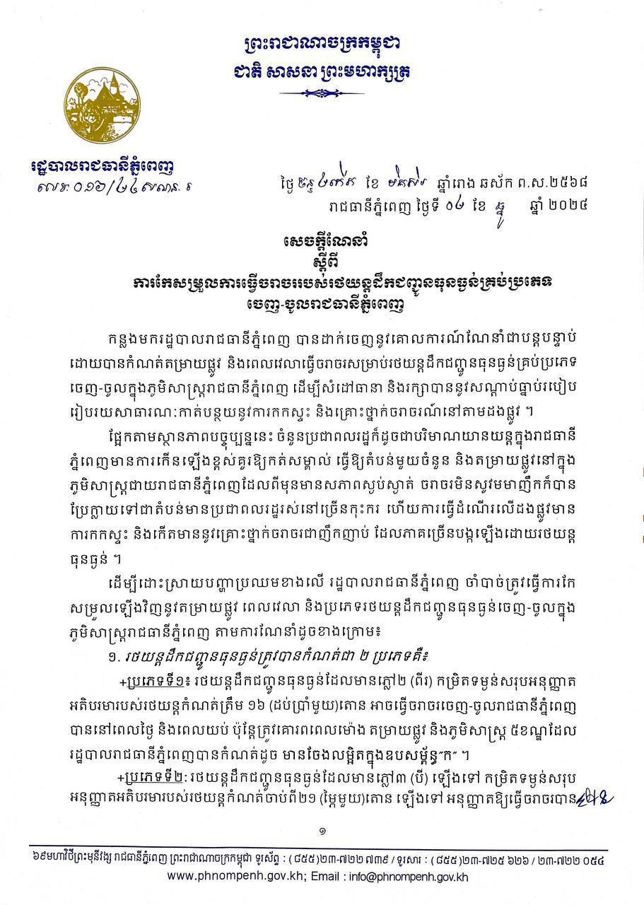 អាជ្ញាធររាជធានីភ្នំពេញ ជូនដំណឹងពីការកែសម្រួលការធ្វើចរាចររបស់រថយន្តដឹកជញ្ជូនធុនធ្ងន់គ្រប់ប្រភេទ ចេញ-ចូលរាជធានីភ្នំពេញ