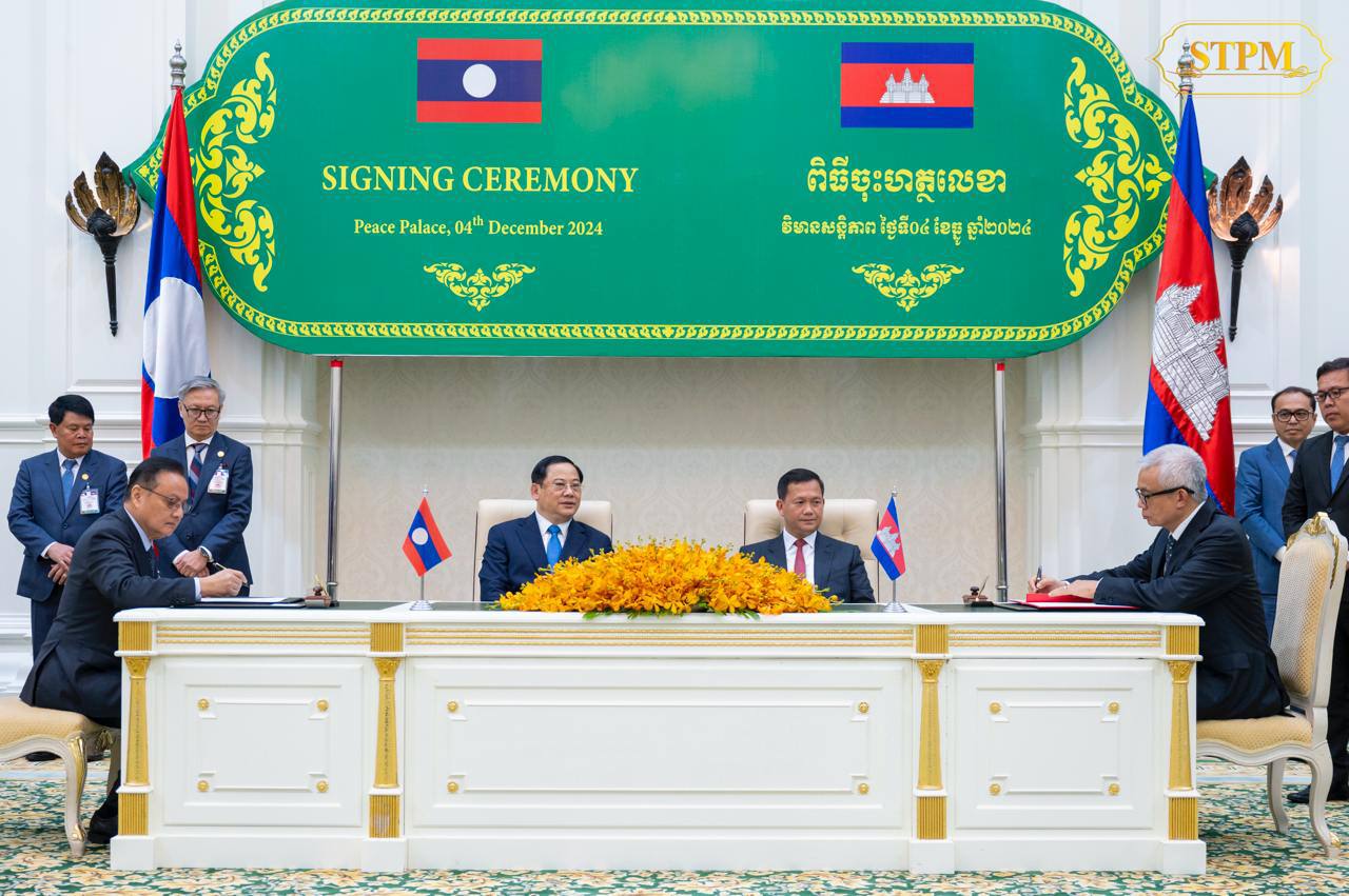 ភ្នំពេញ៖ សម្តេចមហាបវរធិបតី ហ៊ុន ម៉ាណែត នាយករដ្ឋមន្ត្រី នៃព្រះរាជាណាចក្រកម្ពុជា អញ្ជើញចូលរួមជាអធិបតីភាពជាមួយ ឯកឧត្តមបណ្ឌិត សនសៃ ស៊ីផាន់ដន (Sonexay SIPHANDONE) នាយករដ្ឋមន្ត្រី នៃសាធារណរដ្ឋប្រជាធិបតេយ្យប្រជាមានិតឡាវ ក្នុងពិធីចុះអនុស្សរណៈនៃការយោគយល់គ្នារវាងរដ្ឋាភិបាលកម្ពុជា និងរដ្ឋាភិបាលនៃសាធារណរដ្ឋប្រជាធិបតេយ្យប្រជាមានិតឡាវនារសៀលថ្ងៃទី៤ ខែធ្នូ ឆ្នាំ២០២៤។