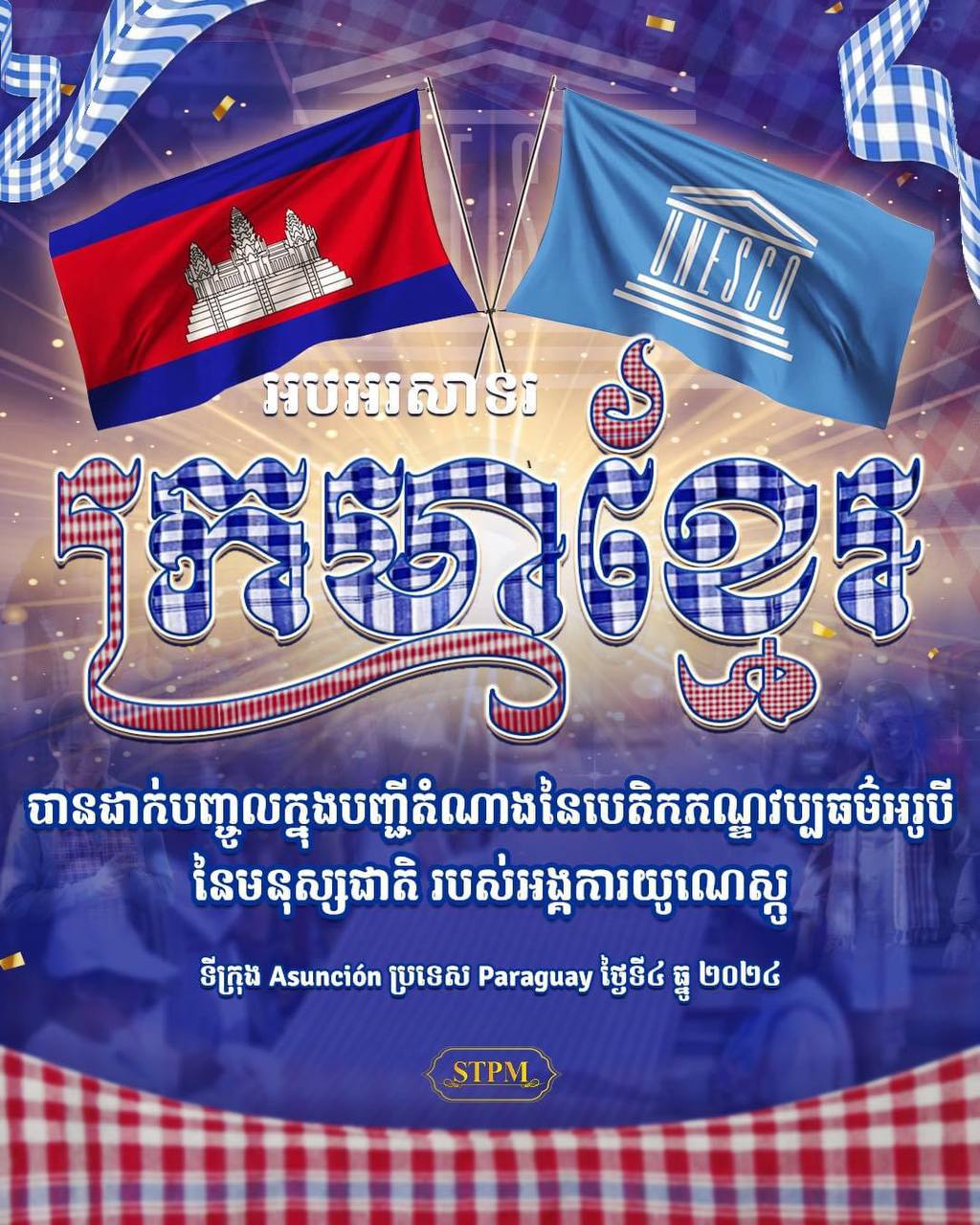 (ភ្នំពេញ)៖ក្រសួងកសិកម្មរុក្ខាប្រមាញ់ និងនេសាទបានអបអរសាទរក្រមាខ្មែរ បានដាក់បញ្ចូលក្នុងបញ្ជីតំណាងនៃបេតិកភណ្ឌវប្បធម៌អរូបីនៃមនុស្សជាតិ របស់អង្គការយូណេស្កូ នៅទីក្រុង អាសង់ស្យុង សាធារណរដ្ឋប៉ារ៉ាហ្គាយ