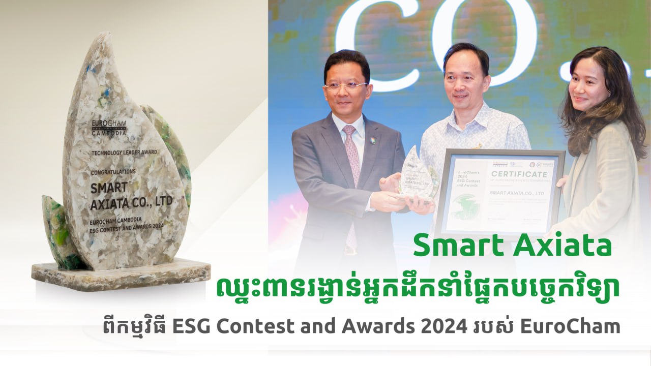 ភ្នំពេញ ៖ ក្រុមហ៊ុន Smart Axiata ដែលជាក្រុមហ៊ុនទូរគមនាគមន៍ និងផ្តល់ដំណោះស្រាយ ICT របស់កម្ពុជាបានឈ្នះពានរង្វាន់ “អ្នកដឹកនាំផ្នែកបច្ចេកវិទ្យា” ពី EuroCham Cambodia ក្នុងកម្មវិធី ESG Contest and Awards Gala Dinner ឆ្នាំ 2024 ដែលធ្វើឡើងក្នុងភាពជាដៃគូជាមួយនឹង ក្រសួងឧស្សាហកម្ម វិទ្យាសាស្ត្រ បច្ចេកវិទ្យា និងនវានុវត្តន៍។