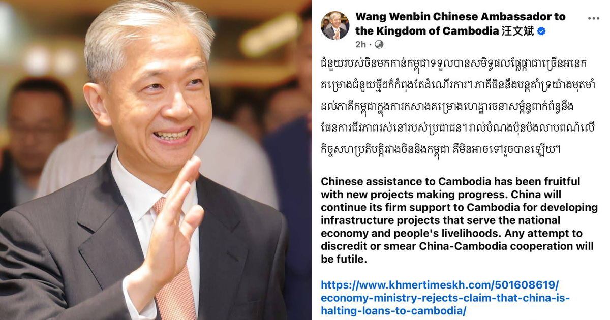 តាមរយៈបណ្តាញសង្គមហ្វេសប៊ុក នៅថ្ងៃទី១៧ ខែធ្ន ឆ្នាំ២០២៤ នេះ ឯកឧត្តម Wang Wenbin ឯកអគ្គរដ្ឋទូតចិនប្រចាំកម្ពុជា បានបញ្ជាក់ថា : “ជំនួយរបស់ចិនមកកាន់កម្ពុជាទទួលបានសមិទ្ធផលផ្លែផ្កាជាច្រើនអនេក គម្រោងជំនួយថ្មីៗ ក៏កំពុងតែដំណើរការ។ ភាគីចិននឹងបន្តគាំទ្រយ៉ាងមុតមាំដល់ភាគីកម្ពុជាក្នុងការកសាងគម្រោងហេដ្ឋារចនាសម្ព័ន្ធពាក់ព័ន្ធនឹងផែនការជីវភាពរស់នៅរបស់ប្រជាជន។ រាល់បំណងប៉ុនប៉ងលាបពណ៌លើកិច្ចសហប្រតិបត្តិរវាងចិននិងកម្ពុជា គឺមិនអាចទៅរួចបានឡើយ។”