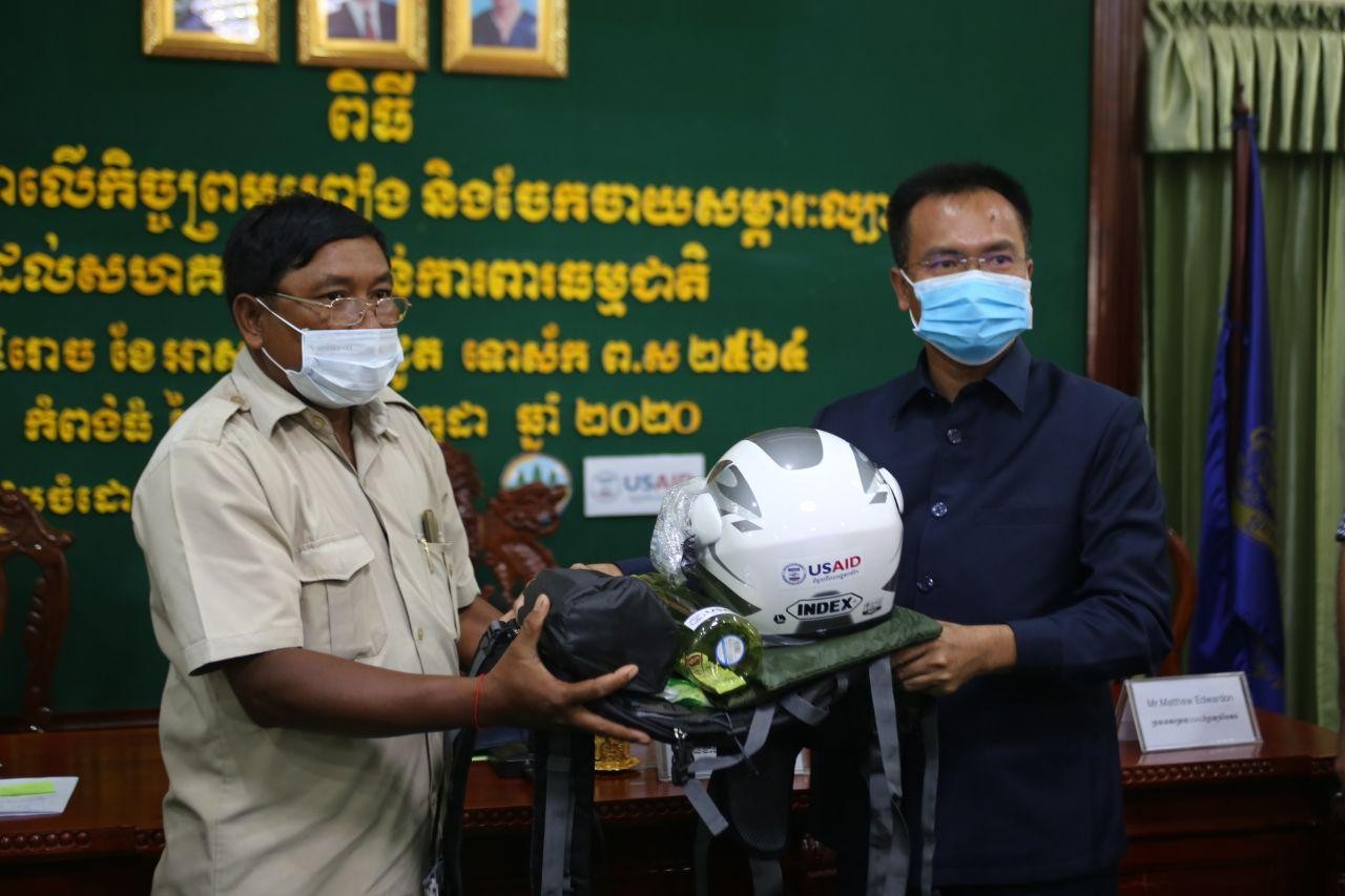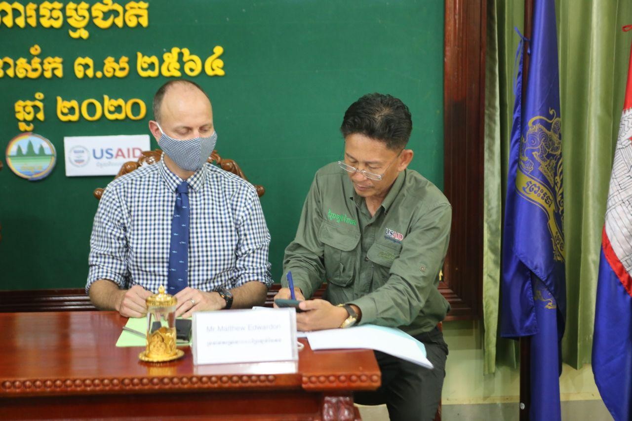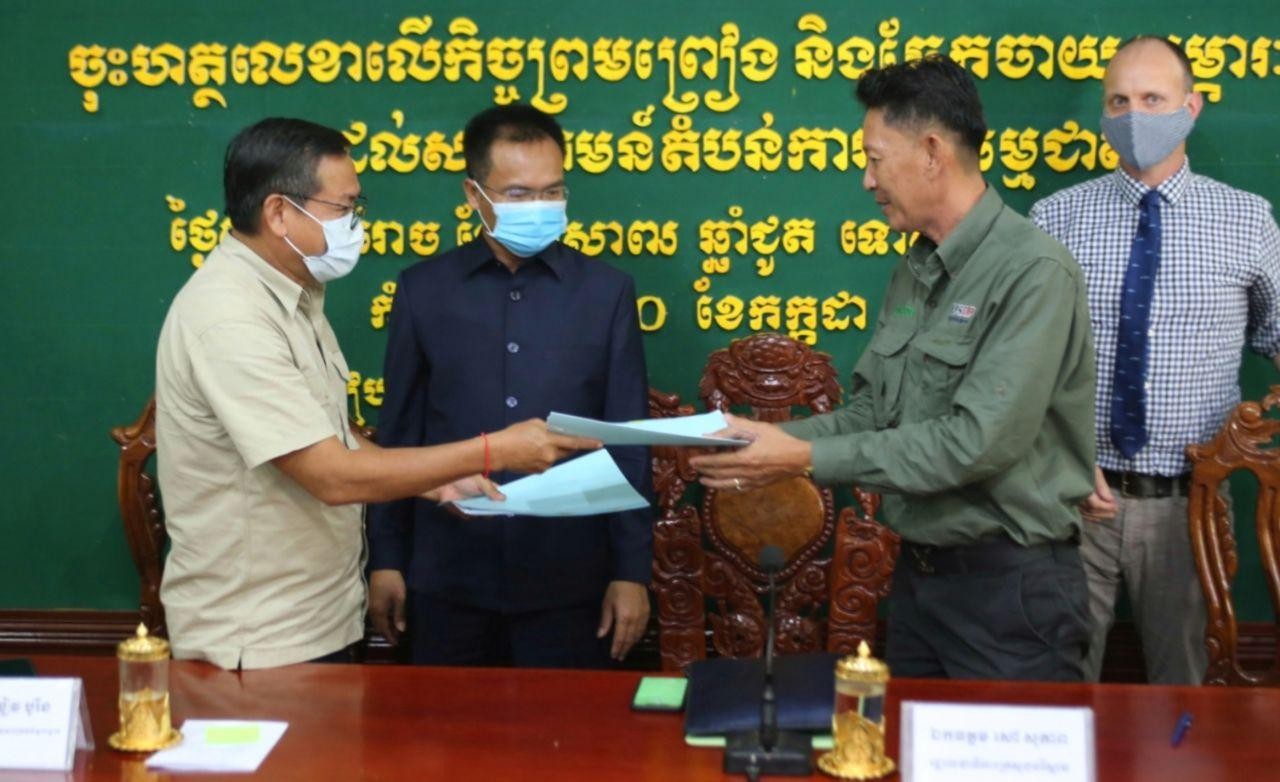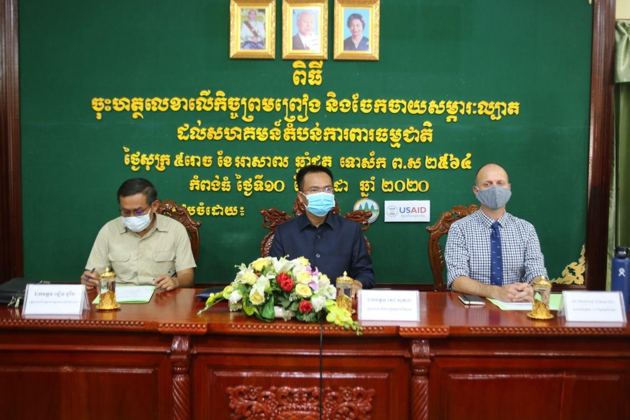 ក្រសួងបរិស្ថាន នៅព្រឹកថ្ងៃសុក្រ ០៥រោច ខែអាសាឍ ឆ្នាំជូត ទោស័ក ព.ស.២៥៦៤ ត្រូវនឹងថ្ងៃទី១០ ខែកក្កដា ឆ្នាំ២០២០ បានអញ្ជើញជាអធិបតីក្នុងពិធីចុះហត្ថលេខាព្រមព្រៀងរវាងក្រសួងបរិស្ថាន និងគម្រោងUSAIDព្រៃឡង់បៃតង និងចែកសម្ភារៈល្បាតដល់សហគមន៍តំបន់ការពារធម្មជាតិចំនួន៤៩ (ក្នុងនោះ១៩សហគមន៍តំបន់ការពារធម្មជាតិ ស្ថិតក្នុងដែនជម្រកសត្វព្រៃ ព្រៃឡង់) នៅក្នុងខេត្តចំនួន៤ នៅជាប់ភូមិសាស្រ្តដែនជម្រកសត្វព្រៃព្រៃឡង់ រួមមានខេត្តកំពង់ធំ ព្រះវិហារ ក្រចេះ និងស្ទឹងត្រែង។ ពិធីចុះហត្ថលេខាប្រព្រឹត្តទៅដោយ ឯកឧត្តម ខៀវបូរិន អគ្គនាយក នៃអគ្គនាយកដ្ឋានសហគមន៍មូលដ្ឋានតំណាងឱ្យក្រសួងបរិស្ថាន និងលោក លោក ម៉ាធ្យូ អេដវើតសុន ប្រធានគម្រោង USAIDព្រៃឡង់បៃតង និងមានការចូលរួមពីថ្នាក់ដឹកនាំ និងមន្រ្តីរាជការក្រសួងបរិស្ថាន តំណាងគម្រោងព្រៃឡង់បៃតង តំណាងអាជ្ញាធរមូលដ្ឋាននិងសហគមន៍តំបន់ការពារធម្មជាតិមួយចំនួន។ លោក ម៉ាធ្យូ អេដវើតសុន ប្រធានគម្រោង USAIDព្រៃឡង់បៃតង បានឱ្យដឹងថា ពិធីនាថ្ងៃនេះបានបង្ហាញកាន់តែច្បាស់ពីការយកចិត្តទុកដាក់កាន់តែប្រសើរថែមទៀតរបស់ក្រសួងបរិស្ថាន សហការជាមួយគម្រោងព្រៃឡង់បៃតងក្នុងពង្រឹងការគ្រប់គ្រងធនធានធម្មជាតិ។ ក្នុងឱកាសនោះ លោក លន់ យ៉េន មេឃុំដងកាំប៉ិត ស្រុកសណ្តាន់ ខេត្តកំពង់ធំ បានតាំងចិត្តចូលរួមជាមួយក្រសួងបរិស្ថាន និងដៃគូសហការ ដើម្បីការពារ និងអភិរក្សធនធានធម្មជាតិ។ ការផ្តល់សម្ភារៈល្បាតដល់សហគមន៍នៅពេលនេះ លើកទឹកចិត្តឱ្យសហគមន៍ចូលរួមសហការល្អថែមទៀតទប់ស្កាត់បទល្មើសធនធានធម្មជាតិ ជាមួយនឹងក្រសួង ស្ថាប័នពាក់ព័ន្ធ និងអាជ្ញាធរគ្រប់លំដាប់ថ្នាក់។ ឯកឧត្តម សៅ សុភាព មានប្រសាសន៍ថាសហគមន៍តំបន់ការពារធម្មជាតិបានដើរតួនាទីសំខាន់ក្នុងការល្បាត ដើម្បីការពារនិងអភិរក្សធនធានធម្មជាតិក្នុងតំបន់ព្រៃឡង់។ ឯកឧត្តម បានបន្ថែមថា ព្រៃឡង់ជាតំបន់ដែលជាសក្តានុពលនៃនិយ័តកម្មទឹករវាងទន្លេមេគង្គ និងទន្លេសាប។ ក្រសួងបរិស្ថាន បានផ្តល់នូវសិទ្ធិស្របច្បាប់ក្នុងការគ្រប់គ្រងចំពោះសហគមន៍ ក្នុងការអភិវឌ្ឍនិងគ្រប់គ្រងធនធានព្រៃឈើរបស់ពួកគេប្រកបដោយនិរន្តរភាព។ ជាមួយគ្នានេះ ឯកឧត្តម រដ្ឋលេខាធិការក្រសួងបរិស្ថាន បានលើកទឹកចិត្តឱ្យសហគមន៍តំបន់ការពារធម្មជាតិទាំងអស់ យកចិត្តទុកដាក់ពង្រឹងការគ្រប់គ្រងធនធានធម្មជាតិឱ្យបានល្អប្រសើរសម្រាប់កូនចៅជំនាន់ក្រោយ ដោយមានការសហការជាមួយមន្រ្តីឧទ្យានុរក្ស ស្ថាប័ន និងអាជ្ញាធរមូលដ្ឋានពាក់ព័ន្ធ។