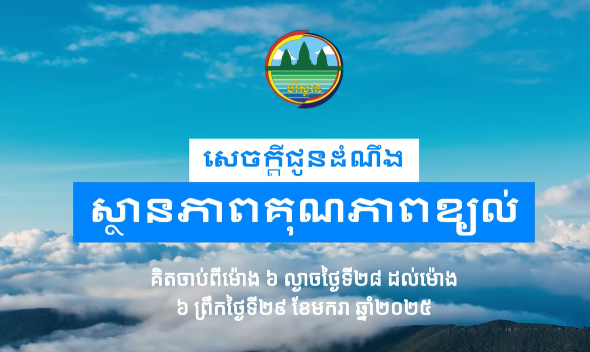 សេចក្ដីជូនដំណឹង៖ ក្រសួងបរិស្ថានសូមជូនដំណឹងអំពីស្ថានភាពគុណភាពខ្យល់នៅក្នុងព្រះរាជាណាចក្រកម្ពុជា សម្រាប់ថ្ងៃទី២៨ ខែមករា ឆ្នាំ២០២៥