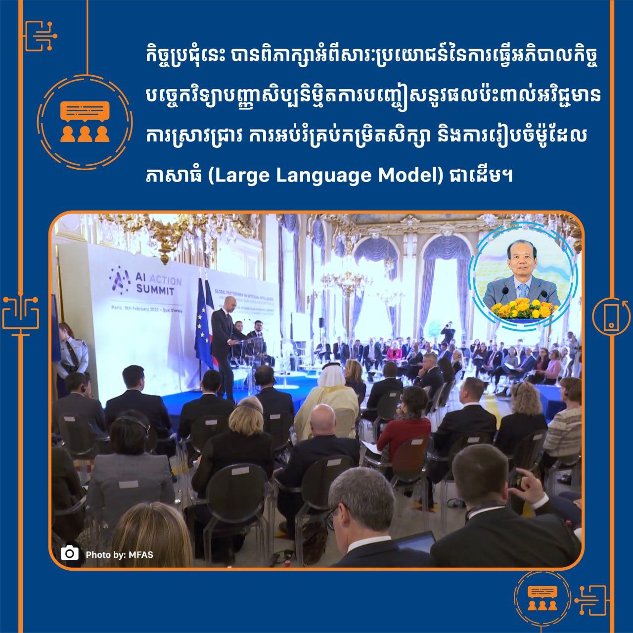 (ប៉ារីស)៖ នៅថ្ងៃទី៩ ខែកុម្ភៈ ឆ្នាំ២០២៥ ឯកឧត្ដម ជា វ៉ាន់ដេត រដ្ឋមន្ត្រីក្រសួងប្រៃសណីយ៍និងទូរគមនាគមន៍តំណាងដ៏ខ្ពង់ខ្ពស់របស់ សម្ដេចធិបតីនាយករដ្ឋមន្ត្រី បានអញ្ជើញចូលរួម “កិច្ចប្រជុំថ្នាក់រដ្ឋមន្ត្រីនៃភាពជាដៃគូសកលលើបញ្ញាសិប្បនិម្មិត” (Ministerial Meeting of the Global Partnership on Artificial Intelligence) នៅទីស្ដីការក្រសួងការបរទេសនៃសាធារណរដ្ឋបារាំង។ កិច្ចប្រជុំនេះមានការចូលរួមពីរដ្ឋមន្ត្រីនិងឥស្សរជននៃប្រទេសជាសមាជិកនៃភាពជាដៃគូសកលលើបញ្ញសិប្បនិម្មិតចំនួន ៤៤ប្រទេស និងប្រទេសមិនមែនជាសមាជិកប្រមាណ ២០ប្រទេស ព្រមទាំងអង្គការអន្តរជាតិមួយចំនួនដូចជាអង្គការសម្រាប់កិច្ចសហប្រតិបត្តិការនិងអភិវឌ្ឍន៍សេដ្ឋកិច្ច (OECD) និងសហភាពទូរគមនាគមន៍អន្តរជាតិជាដើម។