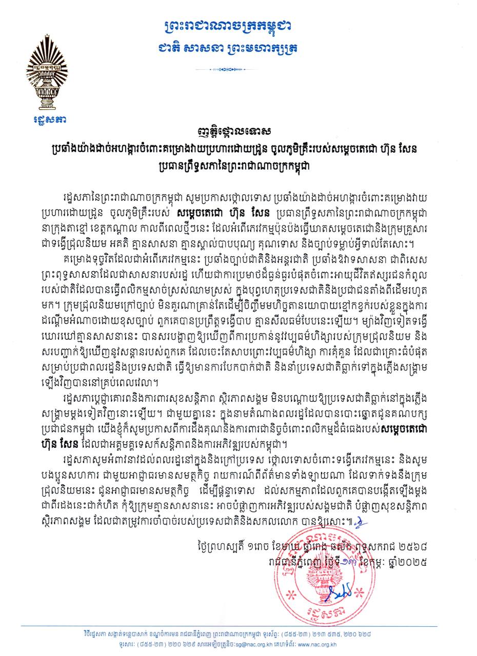 រដ្ឋសភានៃព្រះរាជាណាចក្រកម្ពុជា នៅថ្ងៃទី១៣ ខែកុម្ភៈ ឆ្នាំ២០២៥នេះ បានចេញញត្តិថ្កោលទោស ប្រឆាំងយ៉ាងដាច់អហង្ការចំពោះគម្រោងវាយប្រហារដោយដ្រូន ចូលភូមិគ្រឹះរបស់សម្តេចតេជោ ហ៊ុន សែន ប្រធានព្រឹទ្ធសភា កម្ពុជា ។