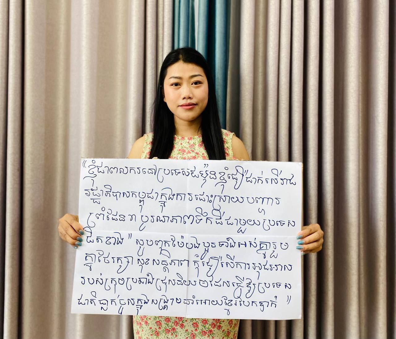 ពលកររូបនេះបានអំពាវនាវឱ្យពលរដ្ឋខ្មែររស់នៅបរទេសទាំងអស់កុំចូលរួមធ្វើបាតុកម្មតាមរយៈការអុចអាលរបស់ក្រុមប្រឆាំងជ្រុលនិយមដែលធ្វើឱ្យប្រទេសជាតិធ្លាក់ចូលក្នុងសង្គ្រាមខ្មែរបែកបាក់ និងមានជម្លោះជាមួយបណ្តាប្រទេសជិតខាង។ បងប្អូនត្រូវរក្សាសន្តិភាពក្នុងប្រទេស និងជឿលើថ្នាក់ដឹកនាំដោះស្រាយតាមរយៈការចរចារដោយសន្តិវិធី។