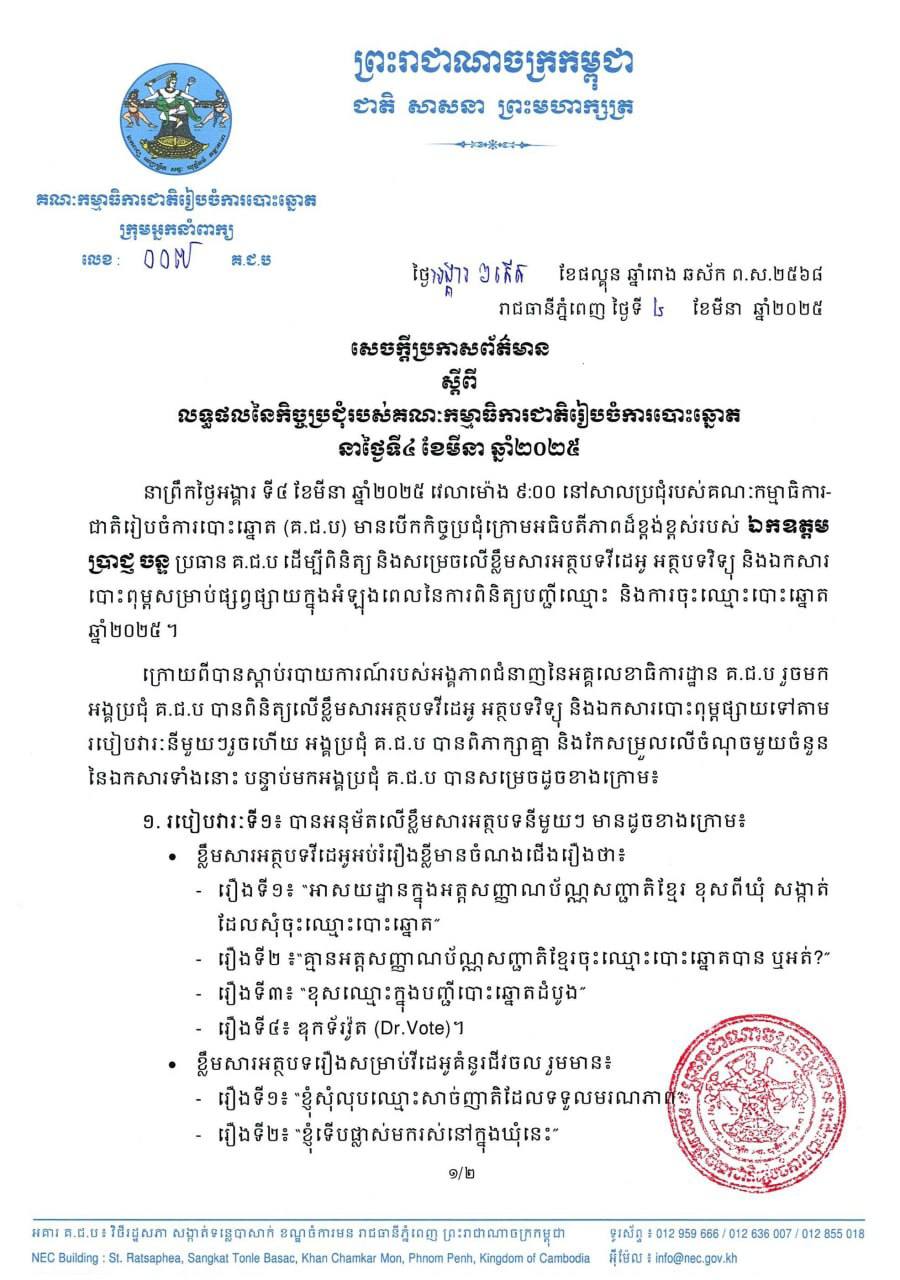 (ភ្នំពេញ)៖ អ្នកនាំពាក្យ គណៈកម្មាធិការជាតិរៀបចំការបោះឆ្នោត (គ.ជ.ប)បានចេញសេចក្តីប្រកាសព័ត៌មានមួយពីលទ្ធផលនៃកិច្ចប្រជុំរបស់គណៈកម្មាធិការជាតិរៀបចំការបោះឆ្នោតពីការពិនិត្យ និងសម្រេចលើខ្លឹមសារអត្ថបទវីដេអូ អត្ថបទវិទ្យុ និងឯកសារ បោះពុម្ពសម្រាប់ផ្សព្វផ្សាយក្នុងអំឡុងពេលនៃការពិនិត្យបញ្ជីឈ្មោះ និងការចុះឈ្មោះបោះឆ្នោ ឆ្នាំ២០២៥ ។