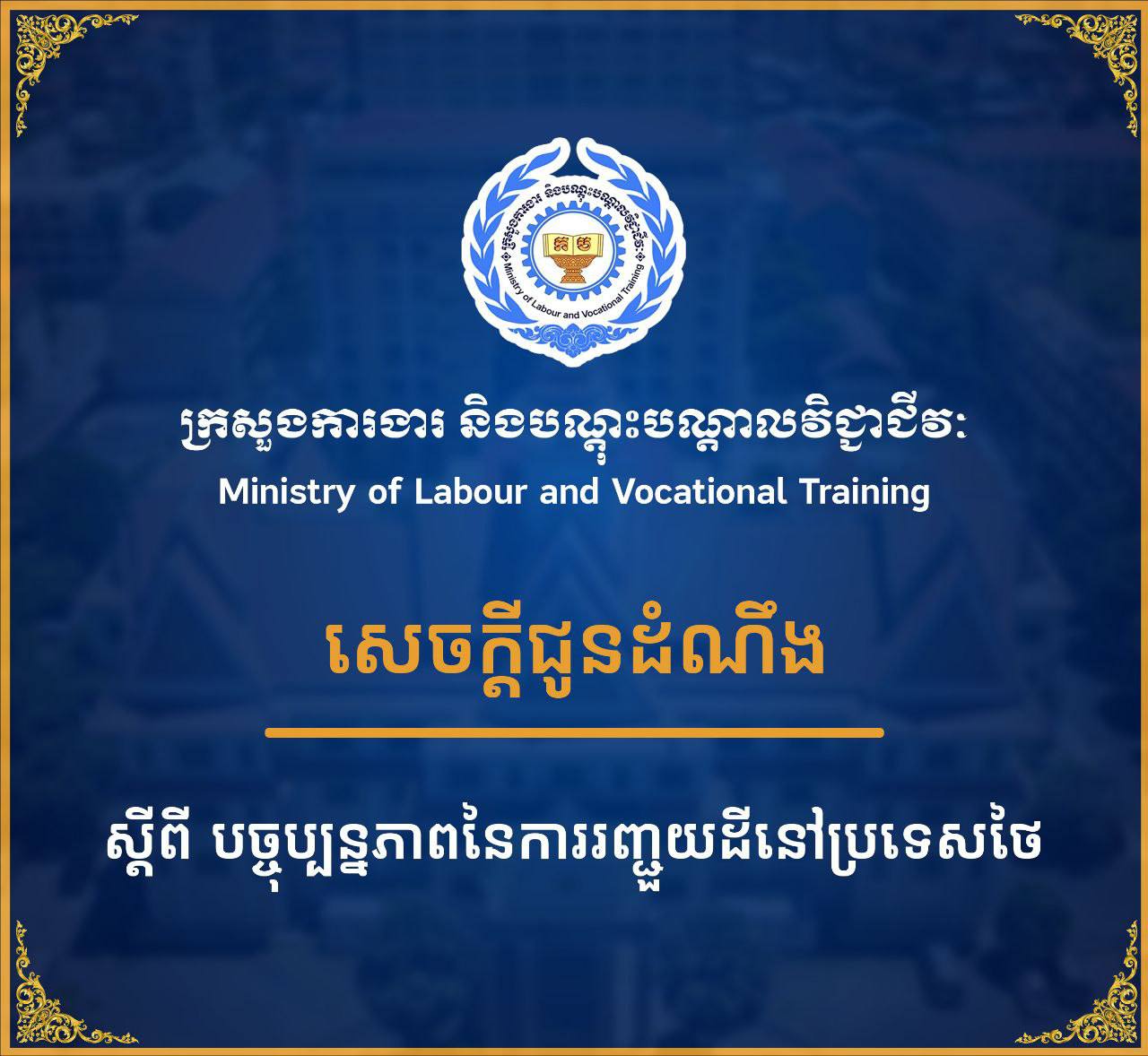 អាស្រ័យដូចបានជម្រាបជូនខាងលើ សូមសាធារណជន ជាពិសេស បងប្អូនពលករខ្មែរដែលកំពុងស្នាក់នៅ និងធ្វើការនៅប្រទេសថៃ ជ្រាបជាព័ត៌មាន៕
