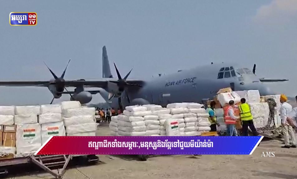 បរទេស៖ ក្រសួងការបរទេសឥណ្ឌា បានបង្ហាញពីសម្ភារៈ, ក្រុមអ្នកសង្គ្រោះ និងសត្វឆ្កែរុករក ដែលត្រូវបានបញ្ជូន ដោយយន្តហោះរបស់កងទ័ពអាកាស ចុះចត នៅទីក្រុងយ៉ាំងហ្គោន ប្រទេសមីយ៉ាន់ម៉ា មួយថ្ងៃបន្ទាប់ពីមានការរញ្ជួយដី ៧.៧រ៉ិចទ័រ បណ្តាលឱ្យខូចខាតយ៉ាងទូលំទូលាយ នៅក្នុងប្រទេសនេះ។