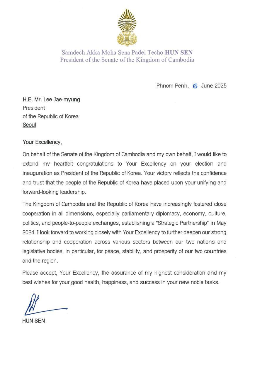 សម្តេចអគ្គមហាសេនាបតីតេជោ ហ៊ុន សែន ប្រធានព្រឹទ្ធសភានៃព្រះរាជាណាចក្រកម្ពុជា ផ្ញើសារលិខិតអបអរសាទរជូន ឯកឧត្តម Lee Jae-myung ក្នុងឱកាសដែលឯកឧត្តម ទទួលបានជាប់ឆ្នោត និងចូលកាន់ដំណែងជាប្រធានាធិបតីនៃសាធារណរដ្ឋកូរ៉េ