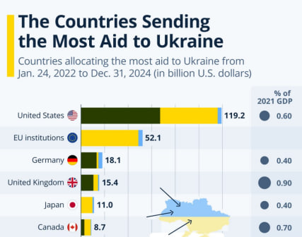 ទឹកប្រាក់ជំនួយទៅកាន់អ៊ុយក្រែន មានលក្ខណៈជាជំនួយហិរញ្ញវត្ថុ មនុស្សធម៌ (អាហារ ថ្នាំពេទ្យ។ល។) និងសព្វាវុធ – Statista