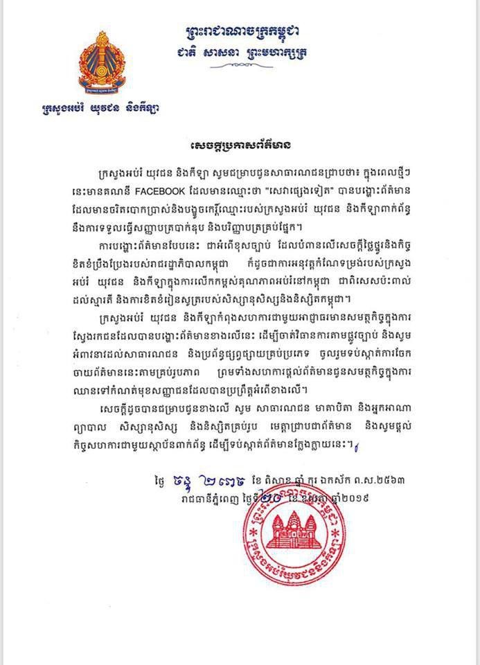 នៅថ្ងៃ២០ឧសភានេះ ក្រសួងអប់រំ បានចេញសេចក្ដីប្រកាសមួយ ដោយបញ្ជាក់ថា ក្នុងពេលថ្មីៗនេះ មានគណនីហ្វេសប៊ុក មួយឈ្មោះថា (សេវាផ្សេងទៀត) បានបង្ហោះព័ត៌មានដែលមានចរិតបោកប្រាស់ និងបង្ខូចកេរ្តិ៍ឈ្មោះរបស់ក្រសួងអប់រំ យុវជន និងកីឡា ពាក់ពន្ធ័នឹងការទទួលធ្វើសញ្ញាបត្របាក់ឌុប និងបរិញ្ញាបត្រគ្រប់ផ្នែក។