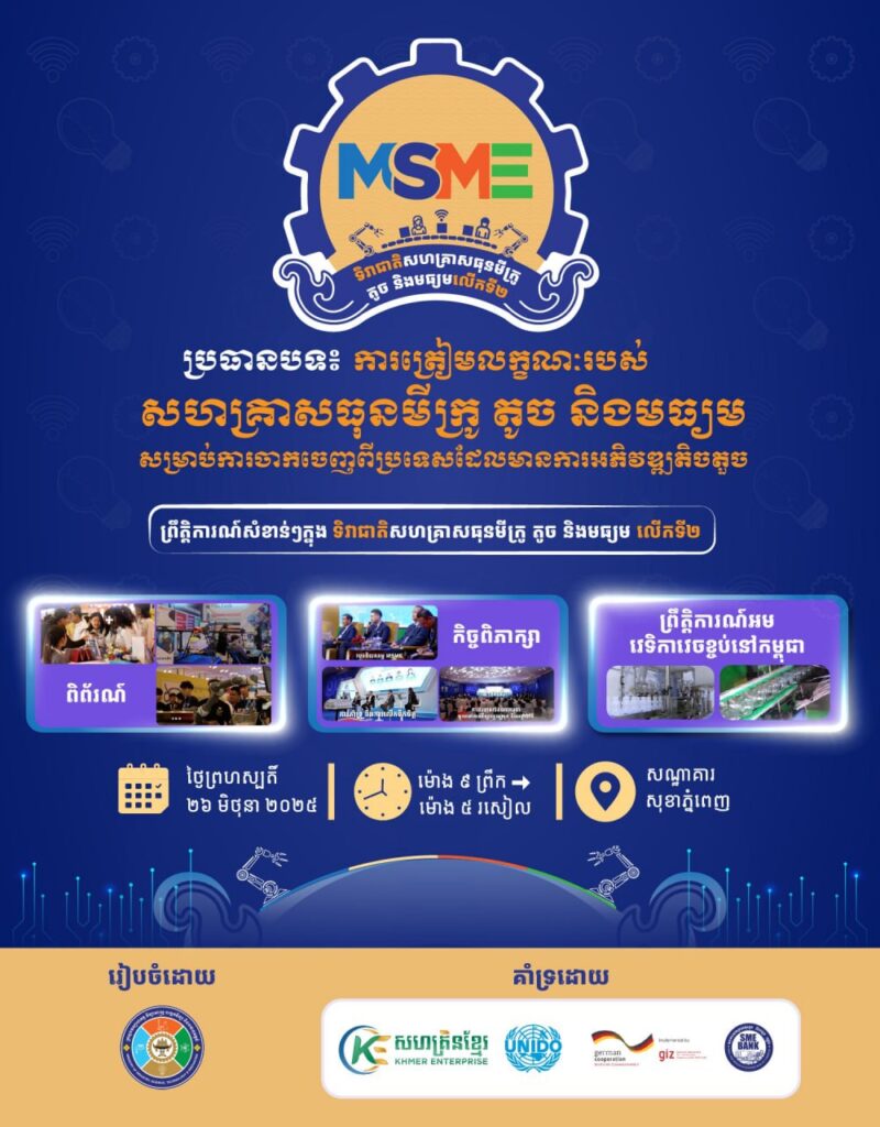 ភ្នំពេញ៖ ក្រសួងឧស្សាហកម្ម វិទ្យាសាស្ត្រ បច្ចេកវិទ្យា និងនវានុវត្តន៍បានឱ្យដឹងថា កម្ពុជានឹងរៀបចំ “ទិវាជាតិសហគ្រាសធុនមីក្រូ តូច និងមធ្យម លើកទី២” ក្រោមប្រធានបទ៖ ការត្រៀមលក្ខណៈរបស់សហគ្រាសធុនមីក្រូ តូច និងមធ្យម សម្រាប់ការចាកចេញពីប្រទេសដែលមានការអភិវឌ្ឍតិចតួចនៅថ្ងៃទី២៦ ខែមិថុនា ឆ្នាំ២០២៥នា សណ្ឋាគាររ៉េស៊ីដង់ សុខាភ្នំពេញ។កម្មវិធីនេះនឹងប្រព្រឹត្តទៅចាប់ពីម៉ោង៩ព្រឹករហូតដល់ម៉ោង៥ល្ងាចនៃថ្ងៃដដែល។