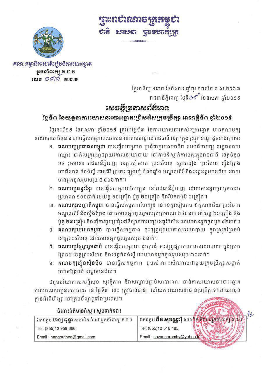 ភ្នំពេញ៖ គណៈកមា្មធិការជាតិរៀបចំការបោះឆ្នោត គ.ជ.ប នៅថ្ងៃទី១៩ ខែឧសភា ឆ្នាំ២០១៩ បញ្ជាក់ថា សម្រាប់ថ្ងៃទី០៣ នៃយុទ្ធនាការឃោសនាបោះឆ្នោតជ្រើសក្រុមប្រឹក្សា អាណត្តិទី៣ ឆ្នាំ២០១៩ មានគណបក្សនយោបាយចំនួន០៦ បានធ្វើសកម្មភាពរបស់ខ្លួន។ នេះបើយោងតាមសេចក្តីប្រកាសព័ត៌មាន របស់ គ.ជ.ប។