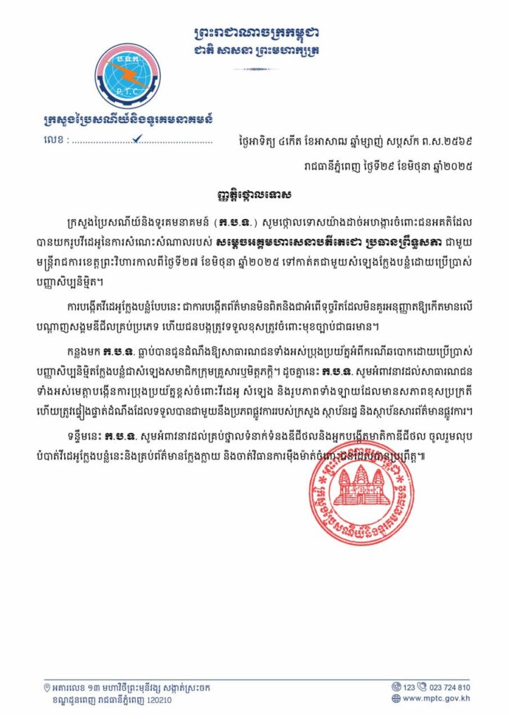 (ភ្នំពេញ)៖ ក្រសួងប្រៃសណីយ៍និងទូរគមនាគមន៍ (ក.ប.ទ.) សូមថ្កោលទោសយ៉ាងដាច់អហង្ការចំពោះជនអគតិដែលបានយករូបវីដេអូនៃការសំណេះសំណាលរបស់ សម្ដេចអគ្គមហាសេនាបតីតេជោ ប្រធានព្រឹទ្ធសភា ជាមួយមន្ត្រីរាជការខេត្តព្រះវិហារកាលពីថ្ងៃទី២៧ ខែមិថុនា ឆ្នាំ២០២៥ ទៅកាត់តជាមួយសំឡេងក្លែងបន្លំដោយប្រើប្រាស់បញ្ញាសិប្បនិម្មិត។