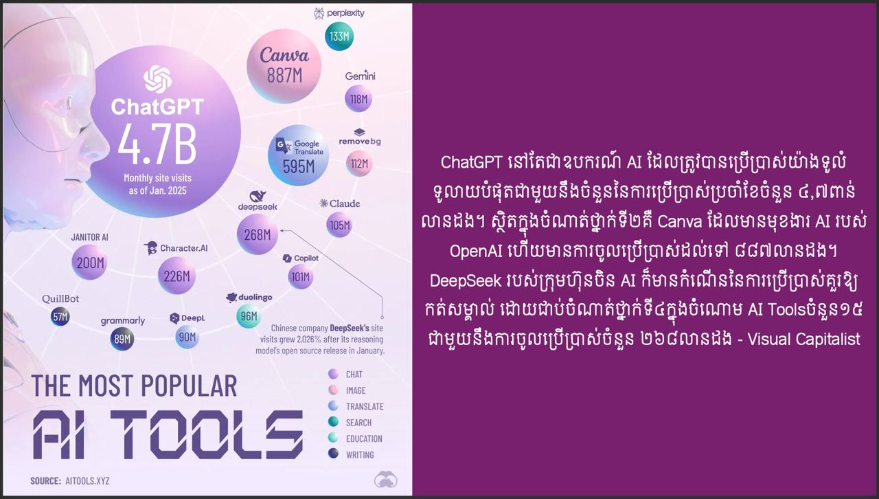 AI Tools នានាដែលត្រូវបានប្រើប្រាស់ជុំវិញពិភពលោកOne-Minuteអត្ថបទដោយ៖ឆាយ រត្ថា – Visual Capitalist #ams1minute ឆាយ រត្ថាលោក ឆាយ រត្ថា ជាបុគ្គលិកផ្នែកព័ត៌មានវិទ្យា នៃអគ្គនាយកដ្ឋានវិទ្យុ និងទូរទស្សន៍ អប្សរាអត្ថបទមុនអត្ថបទបន្ទាប់