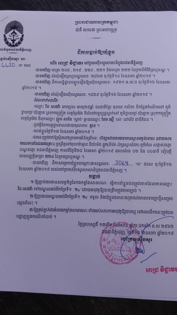 បន្ទាប់មកសមត្ថកិច្ចជំនាញដែលពាក់ព័ន្ធ បានបើកការស៊ើបអង្កេត ជាបន្ទាន់។ ក្នុងនោះដែរ អាវុធហត្ថរាជធានីភ្នំពេញ បានធ្វើការស្រាវជ្រាវប្រមូលភ័ស្តុតាង និងស្វែងរកអត្តសញ្ញាណជនសង្ស័យយ៉ាងយកចិត្តទុកដាក់ អស់រយៈពេល០២សប្តាហ៍ រហូតដល់ថ្ងៃទី១២ ខែឧសភា ឆ្នាំ២០១៩ អាវុធហត្ថរាជធានីភ្នំពេញ បានកំណត់អត្តសញ្ញាណជនសង្ស័យ និងឈានដល់ ធ្វើការឃាត់ខ្លួនជនដៃដល់ម្នាក់ឈ្មោះ រិន សេងរ៉ា ភេទប្រុស អាយុ២៩ឆ្នាំ មានស្រុកកំណើត និងអាសយដ្ឋានបច្ចុប្បន្នរស់នៅ ភូមិខ្នាយកូវ ឃុំត្នោត ស្រុកកញ្ច្រៀវ ខេត្តព្រៃវែង។