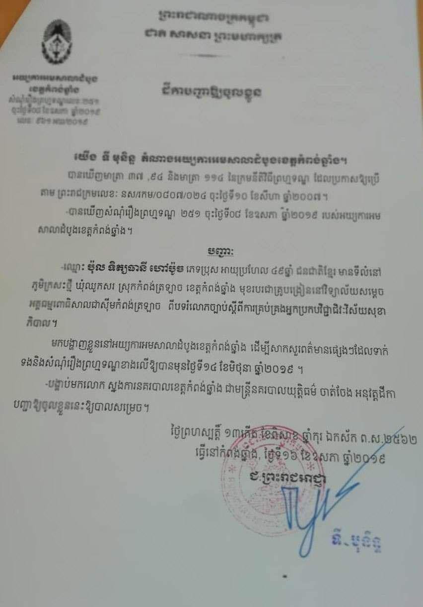 លោកបានបញ្ជាក់ថា ការចាប់ខ្លួនតាមដីការបស់តុលាការបែបនេះ គឺបានបញ្ជូនទៅអយ្យការ សាកសួរភ្លាមៗ ដោយមិនមានយកមកកាន់ស្នងការនគរបាលខេត្តឡើយ។ យ៉ាងនេះក្តី រហូតដល់ម៉ោង១២និង០០នាទីថ្ងៃទី១៧ ខែឧសភានេះ ជនសង្ស័យត្រូវបានយកទៅឃុំខ្លួននៅពន្ធនាគារជាបណ្ដោះអាសន្នហើយ។