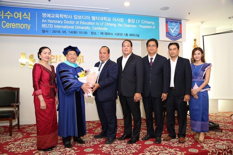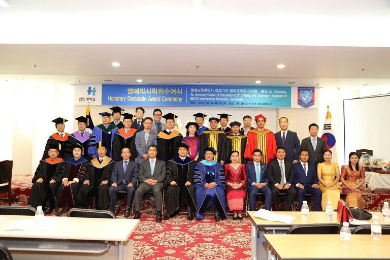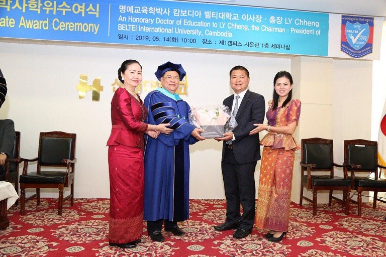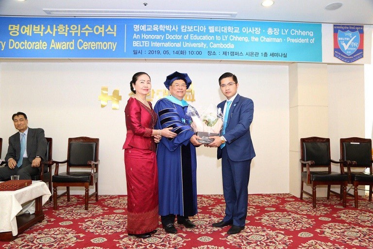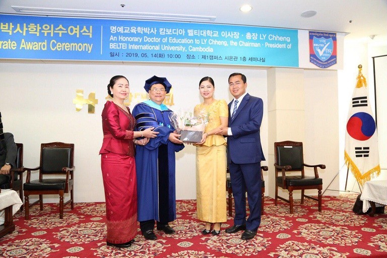 (កូរ៉េខាងត្បូង)៖ ឯកឧត្តមបណ្ឌិត លី ឆេង តំណាងរាស្រ្តមណ្ឌលភ្នំពេញ និងជាអគ្គនាយក ប៊ែលធី គ្រុប បានទទួលសញ្ញាបត្របណ្ឌិតកិតិ្តយសភាពជាអ្នកដឹកនាំក្នុងការអភិវឌ្ឍវិស័យអប់រំ ពីសាកលវិទ្យាល័យស៊ីនហាន (Shinhan University) ដ៏ល្បីមួយរបស់ប្រទេសកូរ៉េខាងត្បូង នាថ្ងៃទី១៤ ខែឧសភា ឆ្នាំ២០១៩ ដោយមានការអញ្ជើញចូលរួមពីថ្នាក់ដឹកនាំរបស់ ប៊ែលធី គ្រុប ចំនួន ៦៧រូប។
