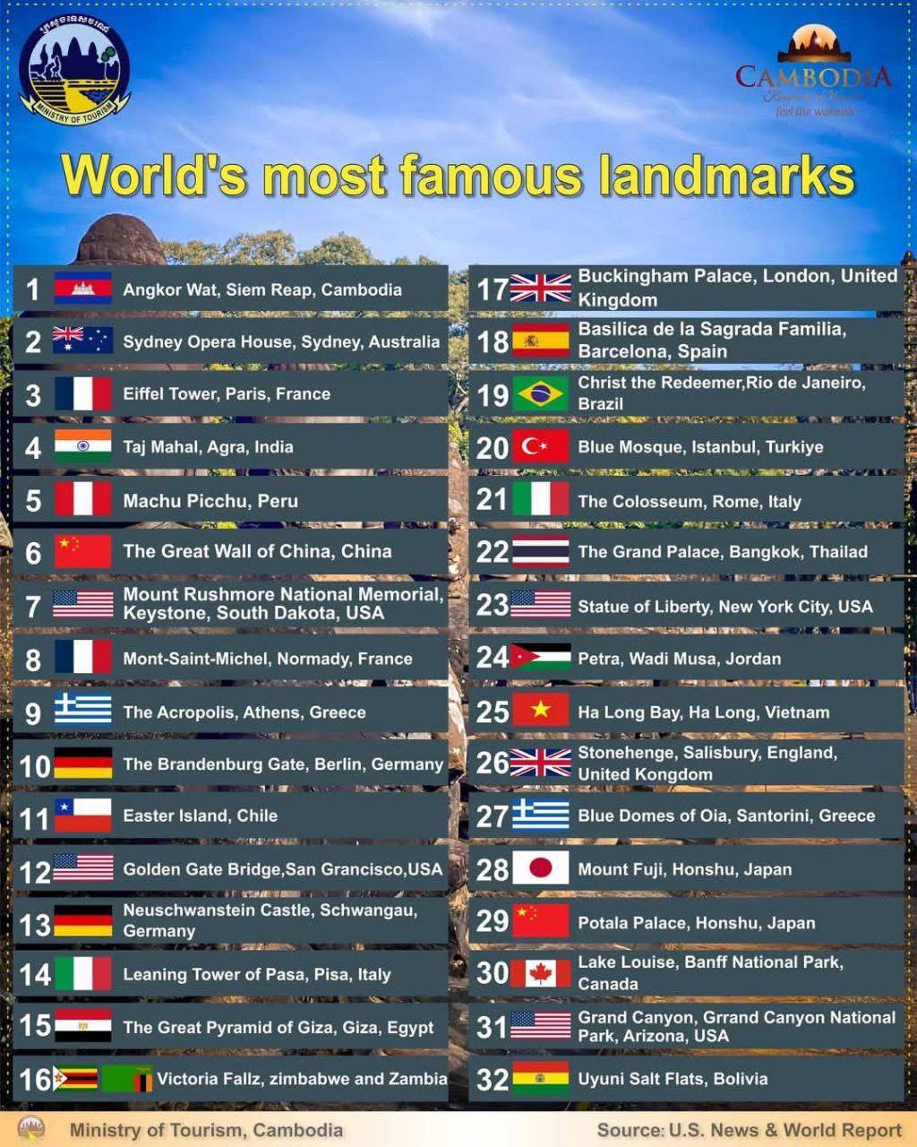 អង្គរវត្តខេត្តសៀមរាប បានជាប់ឈ្មោះជាទីកន្លែងទស្សនាដ៏ល្បីបំផុតនៅក្នុងពិភពលោក ក្នុងចំណោមកន្លែងល្បីបំផុតទាំង៣២