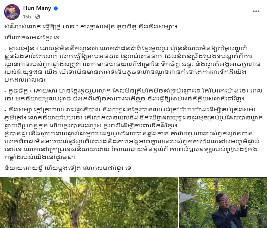 តាមរយៈសំណេរនៅល;បណ្តាញសង្គម ឯកឧត្តម ហ៊ុន ម៉ានី បានចោទសួរថា តើលោកសមជាខ្មែរទេ?
