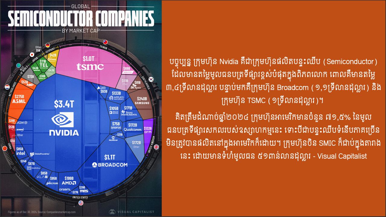 ទំហំនៃមូលធនបត្រទីផ្សារ (market capitalization) របស់ក្រុមហ៊ុនផលិតបន្ទះឈីប (Semiconductor) ទូទាំងពិភពលោកOne-Minuteអត្ថបទដោយ៖ឆាយ រត្ថា – Visual Capitalist #ams1minute ឆាយ រត្ថាលោក ឆាយ រត្ថា ជាបុគ្គលិកផ្នែកព័ត៌មានវិទ្យា នៃអគ្គនាយកដ្ឋានវិទ្យុ និងទូរទស្សន៍ អប្សរាអត្ថបទមុនអត្ថបទបន្ទាប់