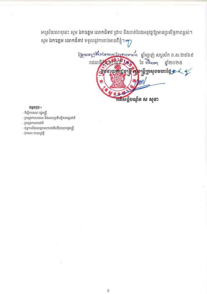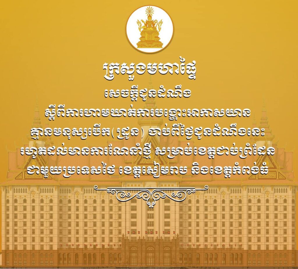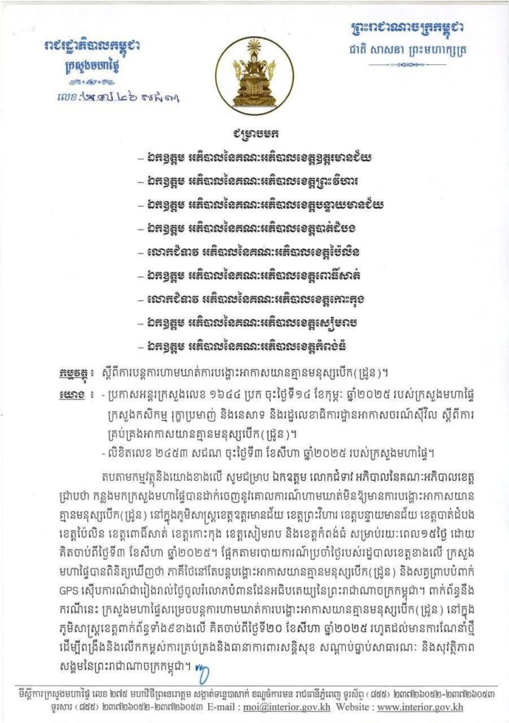 (ភ្នំពេញ)៖ ដើម្បីរក្សាសន្តិសុខ សណ្តាប់ធ្នាប់សាធារណៈ និងសុវត្ថិភាពសង្គម និងការគ្រប់គ្រងនូវស្ថានការចំពោះមុខ បានបន្តហាមឃាត់មិនឱ្យបង្ហោះយន្តហោះគ្មានមនុស្សបើក(ដ្រូន) រយៈពេល ១៥ថ្ងៃ បន្តទៀតចាប់ពីថ្ងៃទី២០ ខែសីហា ឆ្នាំ២០២៥តទៅ ចំពោះខេត្តដែលនៅជាព្រំដែនកម្ពុជ-ថៃចំនួន៧ និងខេត្តពាក់ព័ន្ធចំនួន ២ ។