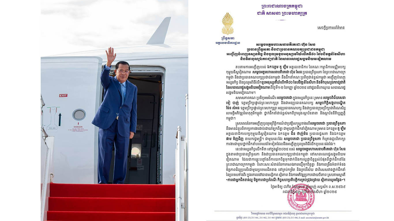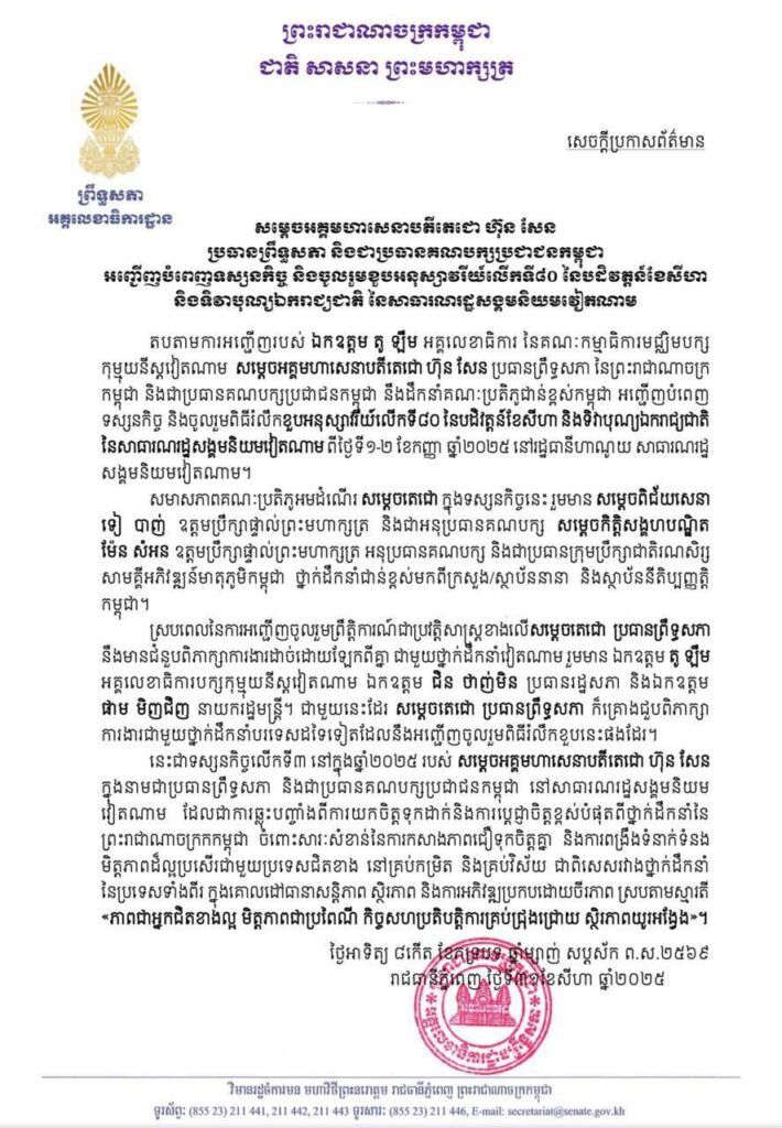 (ភ្នំពេញ)៖ សម្តេចអគ្គមហាសេនាបតីតេជោ ហ៊ុន សែន ប្រធានព្រឹទ្ធសភា នៃព្រះរាជាណាចក្រកម្ពុជា និងជាប្រធានគណបក្សប្រជាជនកម្ពុជា នឹងដឹកនាំគណៈប្រតិភូជាន់ខ្ពស់កម្ពុជា អញ្ជើញបំពេញទស្សនកិច្ច និងចូលរួមពិធីរំលឹកខួបអនុស្សាវរីយ៍លើកទី៨០ នៃបដិវត្តន៍ ខែសីហា និងទិវាបុណ្យឯករាជ្យជាតិនៃសាធារណរដ្ឋសង្គមនិយមវៀតណាម ពីថ្ងៃទី១-២ ខែកញ្ញា ឆ្នាំ២០២៥ នៅរដ្ឋធានីហាណូយ សាធារណរដ្ឋសង្គមនិយមវៀតណាម តបតាមការអញ្ជើញរបស់ ឯកឧត្តម តូ ឡឺម អគ្គលេខាធិការ នៃគណៈកម្មាធិការមជ្ឈិមបក្សកុម្មុយនីស្តវៀតណាម ។