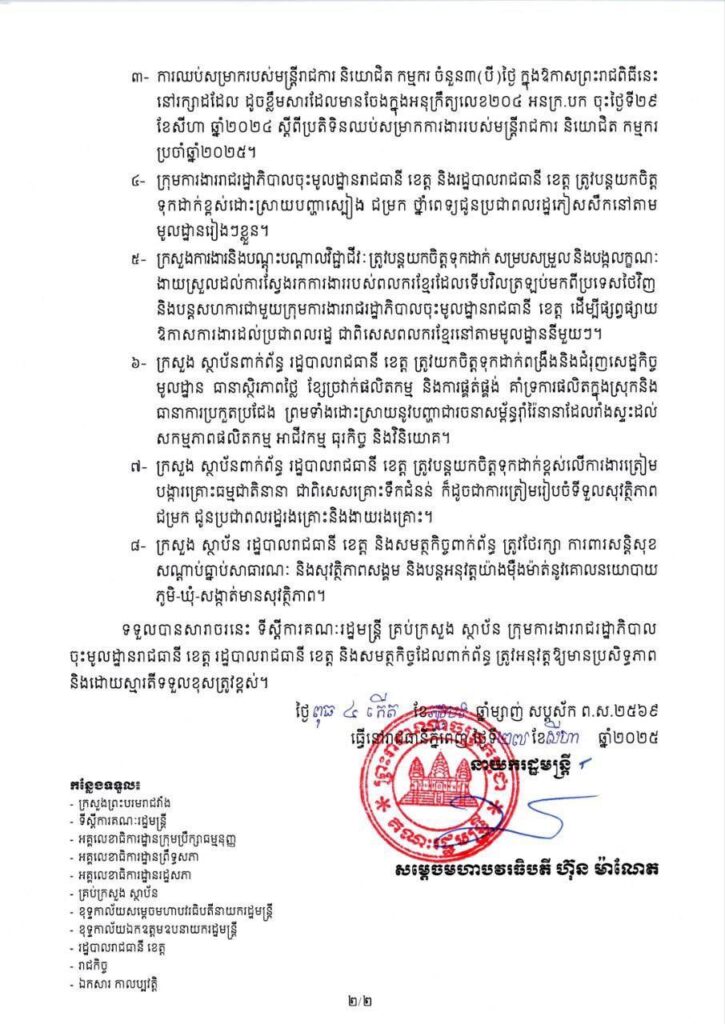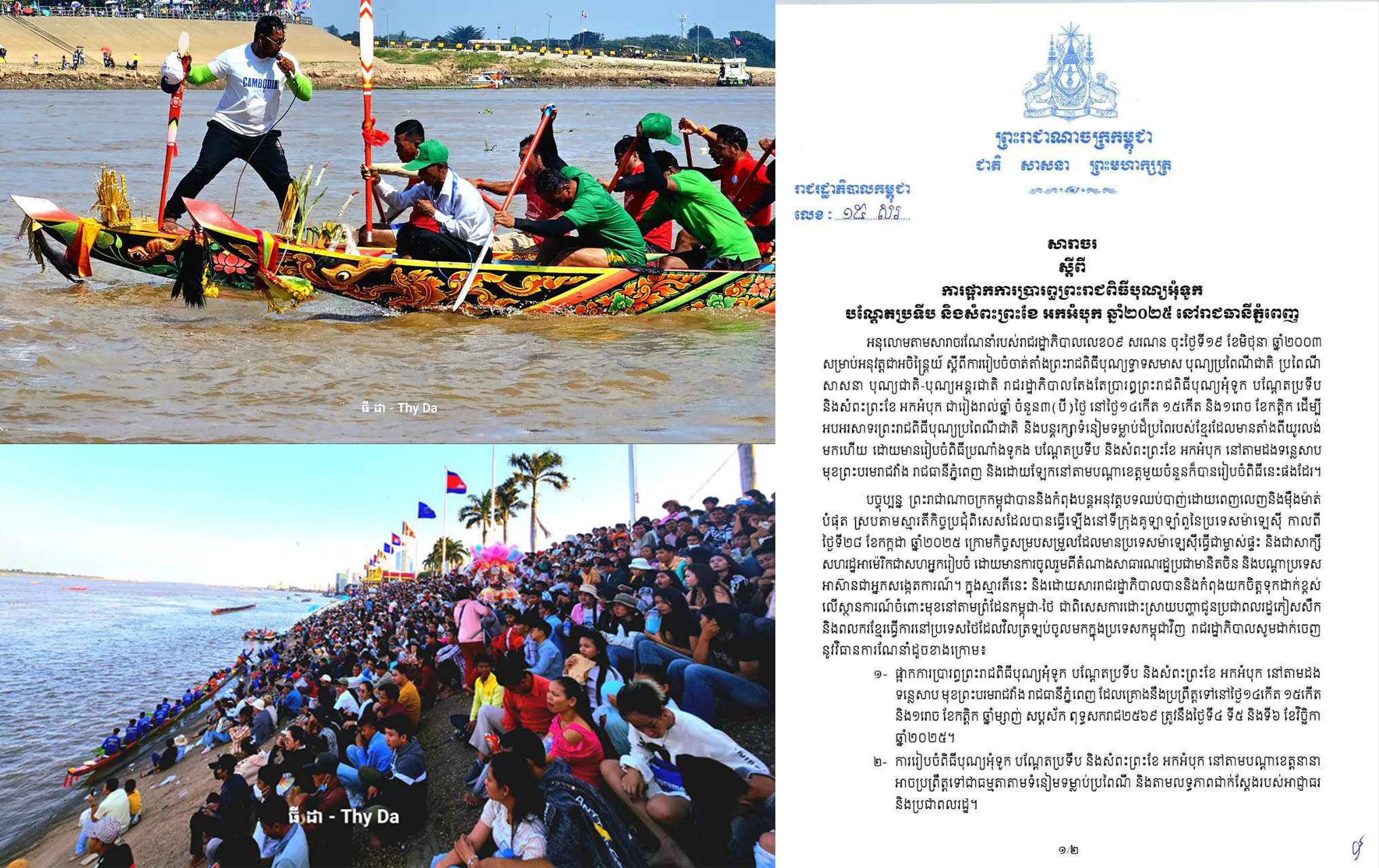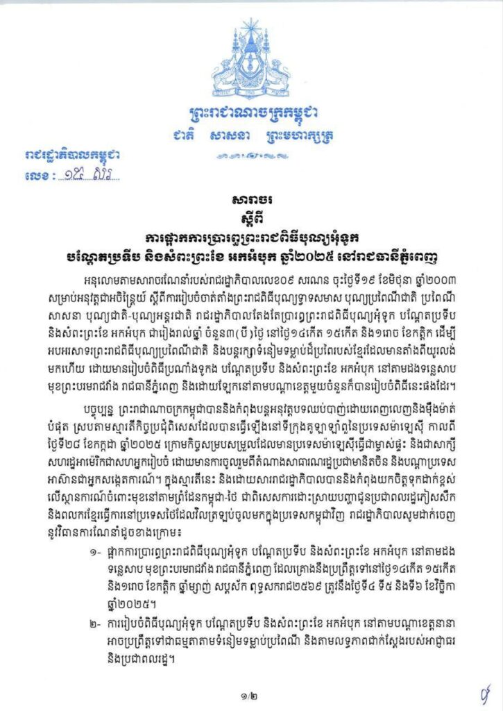 ១- ផ្អាកការប្រារព្ធព្រះរាជពិធីបុណ្យអុំទូក បណ្តែតប្រទីប និងសំពះព្រះខែ អកអំបុក នៅតាមដង ទន្លេសាប មុខព្រះបរមរាជវាំង រាជធានីភ្នំពេញ ដែលគ្រោងនឹងប្រព្រឹត្តទៅនៅថ្ងៃ១៤កើត ១៥កើត និង១រោច ខែកត្តិក ឆ្នាំម្សាញ់ សប្តស័ក ពុទ្ធសករាជ២៥៦៩ ត្រូវនឹងថ្ងៃទី៤ ទី៥ និងទី៦ ខែវិច្ឆិកា ឆ្នាំ២០២៥។
