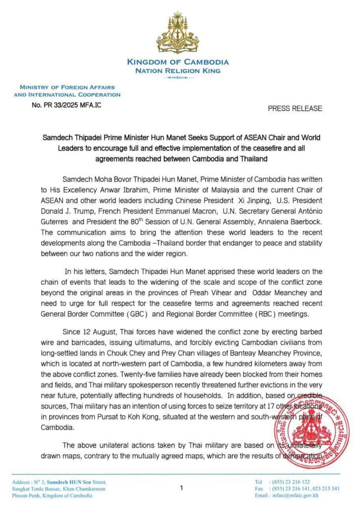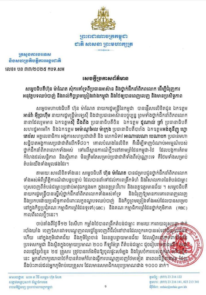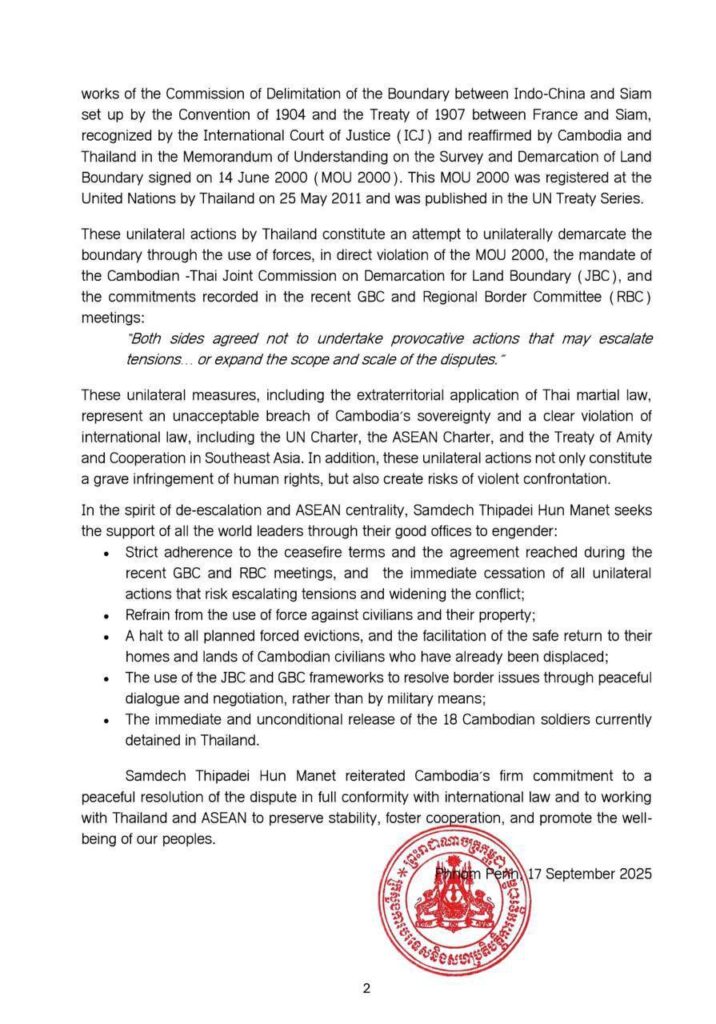 សម្តេចធិបតី ហ៊ុន ម៉ាណែត បានផ្ញើសារលិខិតជូន ឯកឧត្តម អាន់វ៉ា អ៊ីប្រាហ៊ីម នាយករដ្ឋមន្ត្រីម៉ាឡេស៊ី និងជាប្រធានអាស៊ានបច្ចុប្បន្ន ព្រមទាំងថ្នាក់ដឹកនាំពិភពលោក នានាដែលរួមមាន ឯកឧត្តមស៊ី ជើងពឹង ប្រធានាធិបតីចិន ឯកឧត្តម ដូណាល់ ត្រាំ ប្រធានាធិបតី សហរដ្ឋអាមេរិក និងឯកឧត្តម អេម៉ាណូអែល ម៉ាក្រុង ប្រធានាធិបតីបារាំង ឯកឧត្តមអង់តូនីញូ ហ្គោ តេរ៉េស អគ្គលេខាធិការ អង្គការសហប្រជាជាតិ និង លោកជំទាវ អាណាលេណា បេណាបក ប្រធានមហា សន្និបាតអង្គការសប្រជាជាតិលើកទី៨០។ គោលបំណងនៃលិខិត គឺដើម្បីទាញចំណាប់អារម្មណ៍របស់ ថ្នាក់ដឹកនាំពិភពលោកទាំងអស់ ទៅលើស្ថានការណ៍ថ្មីៗនៅតាមព្រំដែនកម្ពុជា-ថៃ ដែលបង្កការគំរាម កំហែងដល់សន្តិភាព និងស្ថិរភាព មិនត្រឹមតែសម្រាប់ប្រជាជាតិទាំងពីរប៉ុណ្ណោះទេ គឺថែមទាំងសម្រាប់ តំបន់យើងទាំងមូលផងដែរ។