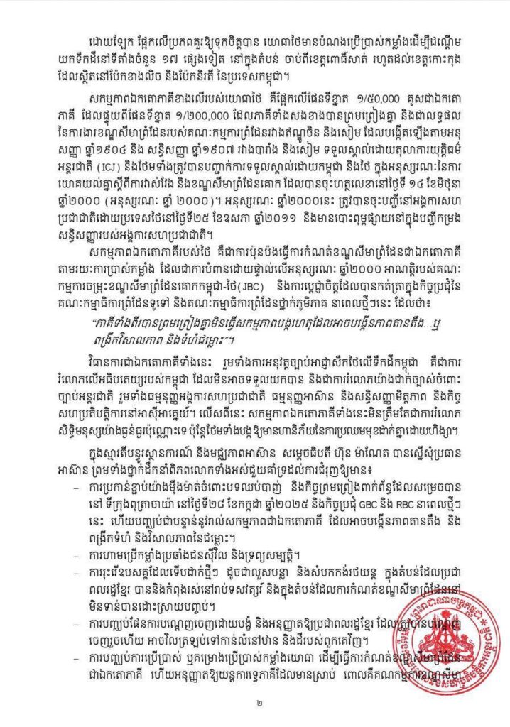 វិធានការជាឯកតោភាគីទាំងនេះ រួមទាំងការអនុវត្តច្បាប់អាជ្ញាសឹកថៃលើទឹកដីកម្ពុជា គឺជាការ រំលោភលើអធិបតេយ្យរបស់កម្ពុជា ដែលមិនអាចទទួលយកបាន និងជាការរំលោភយ៉ាងជាក់ច្បាស់ចំពោះ ច្បាប់អន្តរជាតិ រួមទាំងធម្មនុញ្ញអង្គការសហប្រជាជាតិ ធម្មនុញ្ញអាស៊ាន និងសន្ធិសញ្ញាមិត្តភាព និងកិច្ច សហប្រតិបត្តិការនៅអាស៊ីអាគ្នេយ៍។ លើសពីនេះ សកម្មភាពឯកតោភាគីទាំងនេះមិនត្រឹមតែជាការរំលោភ សិទ្ធិមនុស្សយ៉ាងធ្ងន់ធ្ងរប៉ុណ្ណោះទេ ប៉ុន្តែថែមទាំងបង្កឱ្យមានហានិភ័យនៃការប្រឈមមុខដាក់គ្នាដោយហិង្សា។