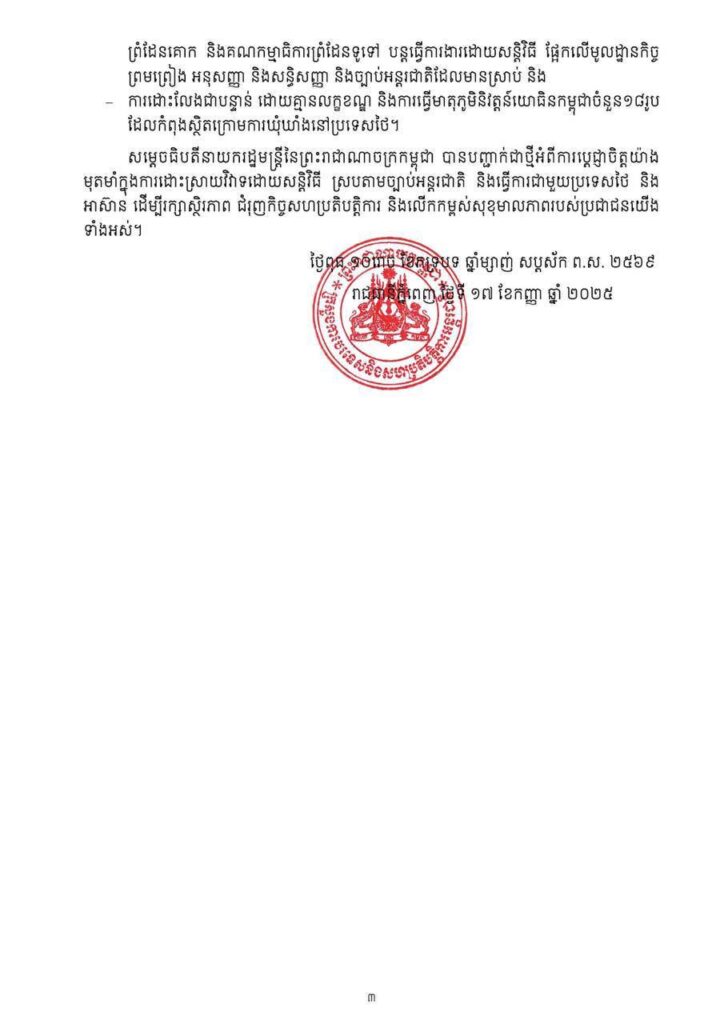 ការប្រកាន់ខ្ជាប់យ៉ាងម៉ឺងម៉ាត់ចំពោះបទឈប់បាញ់ និងកិច្ចព្រមព្រៀងពាក់ព័ន្ធដែលសម្រេចបាន នៅ ទីក្រុងពុត្រាចាយ៉ា នៅថ្ងៃទី២៨ ខែកក្កដា ឆ្នាំ២០២៥ និងកិច្ចប្រជុំ GBC និង RBC នាពេលថ្មីៗ នេះ ហើយបញ្ឈប់ជាបន្ទាន់នូវរាល់សកម្មភាពជាឯកតោភាគី ដែលអាចបង្កើនភាពតានតឹង និង ពង្រីកទំហំ និងវិសាលភាពនៃជម្លោះ។ ការហាមប្រើកម្លាំងប្រឆាំងជនស៊ីវិល និងទ្រព្យសម្បត្តិ។ ការរុះរើឧបសគ្គដែលទើបដាក់ថ្មីៗ ដូចជាលួសបន្លា និងសំបកកង់រថយន្ត ក្នុងតំបន់ដែលប្រជា ពលរដ្ឋខ្មែរ បាននិងកំពុងរស់នៅរាប់ទសវត្សរ៍ និងក្នុងតំបន់ដែលការកំណត់ខណ្ឌសីមាព្រំដែននៅមិនទាន់បានដោះស្រាយបញ្ចប់ ។