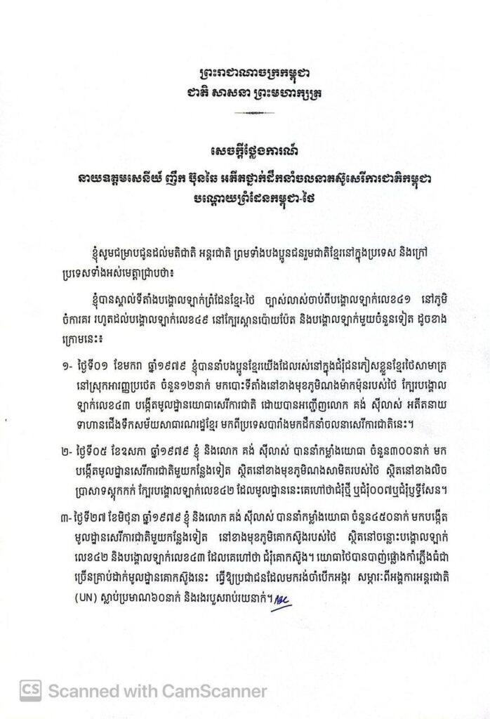 សេចក្តីថ្លែងការណ៍របស់ នាយឧត្តមសេនីយ៍ ញឹក ប៊ុនឆៃ អតីតថ្នាក់ដឹកនាំចលនាតស៊ូសេរីការជាតិកម្ពុជា បណ្តោយព្រំដែនកម្ពុជា-ថៃ
