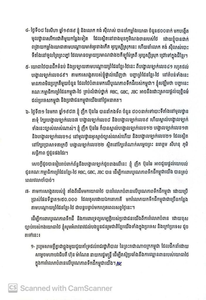 អតីតថ្នាក់ដឹកនាំចលនាតស៊ូសេរីការជាតិកម្ពុជា បណ្តោយព្រំដែនកម្ពុជា-ថៃ នាយឧត្តមសេនីយ៍ ញឹក ប៊ុនឆៃ បានបញ្ជាក់ថា ”តាមការសង្កេតរបស់ខ្ញុំ តាំងពីដើមមកយោធាថៃ បានរំលោភបំពានលើបូរណភាពទឹកដីកម្ពុជា ដោយប្រើ ប្រាស់ផែនទីខ្នាត១/៥០.០០០ ដែលគូសដោយឯកតោភាគី មករំលោភយកទឹកដីកម្ពុជា ជាច្រើនកន្លែង តាមបណ្តោយព្រំដែនខ្មែរ-ថៃ ជាបន្តបន្ទាប់មករហូតពេលសព្វថ្ងៃនេះ”៕