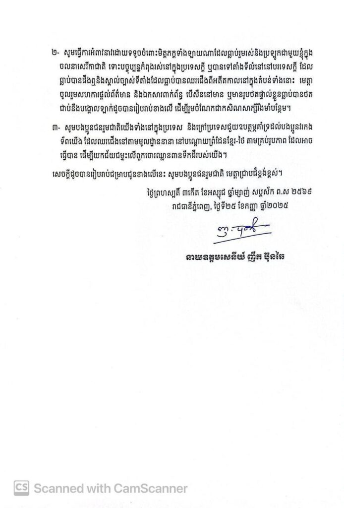(ភ្នំពេញ)៖ នាយឧត្តមសេនីយ៍ ញឹក ប៊ុនឆៃ អតីតថ្នាក់ដឹកនាំចលនាតស៊ូសេរីការជាតិកម្ពុជា បណ្តោយព្រំដែនកម្ពុជា-ថៃបានចេញសេចក្តីថ្លែងការណ៍នៅថ្ងៃទី ២៥ ខែកញ្ញា ឆ្នាំ២០២៥ទាក់ទិនទៅនឹងបញ្ហាព្រំដែនរវាងកម្ពុជា-ថៃ ដែល ឯកឧត្តមលើកមកបង្ហាញពីការឈ្លានពានរបស់កងទ័ពថៃមកលើទឹកដីកម្ពុជា។
