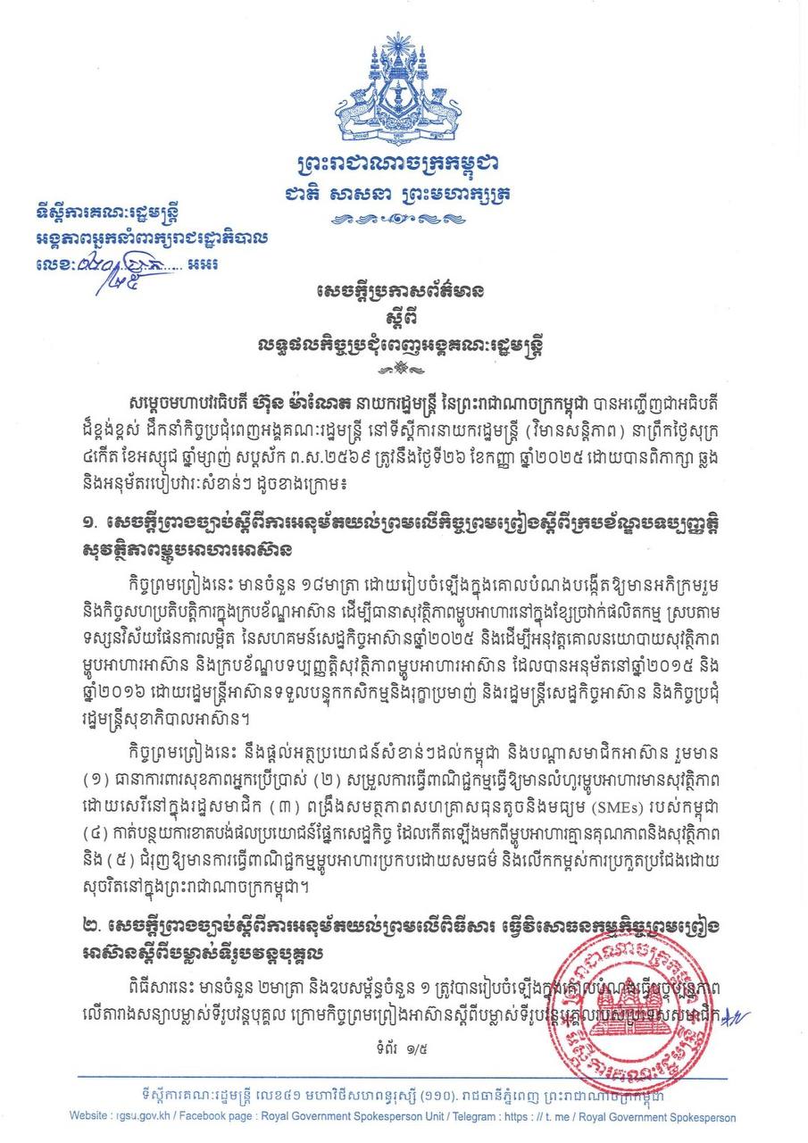 ការថ្លែងបែបនេះ ធ្វើឡើងក្នុងឱកាសដែល សម្តេចមហាបវរធិបតី ហ៊ុន ម៉ាណែត អញ្ជើញជាអធិបតីដ៏ខ្ពង់ខ្ពស់ ដឹកនាំកិច្ចប្រជុំពេញអង្គគណៈរដ្ឋមន្ត្រី នៅទីស្តីការនាយករដ្ឋមន្ត្រី (វិមានសន្តិភាព) នាព្រឹកទី២៦ ខែកញ្ញា ឆ្នាំ២០២៥ ។