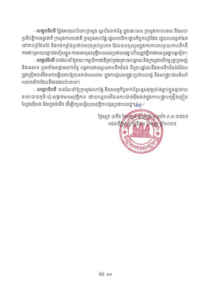 បើតាមសេចក្ដីប្រកាសព័ត៌មាន ស្ដីពី លទ្ធផលកិច្ចប្រជុំពេញ អង្គគណៈរដ្ឋមន្ត្រី សម្តេចធិបតី មានប្រសាសនថា សូមអរគុណចំពោះក្រសួង ស្ថាប័នពាក់ព័ន្ធ ក្នុងនោះ មានក្រសួងការបរទេស និងសហប្រតិបត្តិការអន្តរជាតិ ក្រសួងការពារជាតិ ក្រសួងមហាផ្ទៃ រដ្ឋលេខាធិការដ្ឋានកិច្ចការព្រំដែន រដ្ឋបាលខេត្តទាំង៧ នៅជាប់ព្រំដែនថៃ និងកងកម្លាំងប្រដាប់អាវុធគ្រប់ប្រភេទ ដែលបានចូលរួមក្នុងការការពារបូរណភាពទឹកដី ការដោះស្រាយបញ្ហាជនភៀសខ្លួន ការធានាសុខសុវត្ថិភាពរបស់ប្រជាពលរដ្ឋ ហើយត្រូវធ្វើការងារនេះរួមគ្នាបន្តទៀត»។