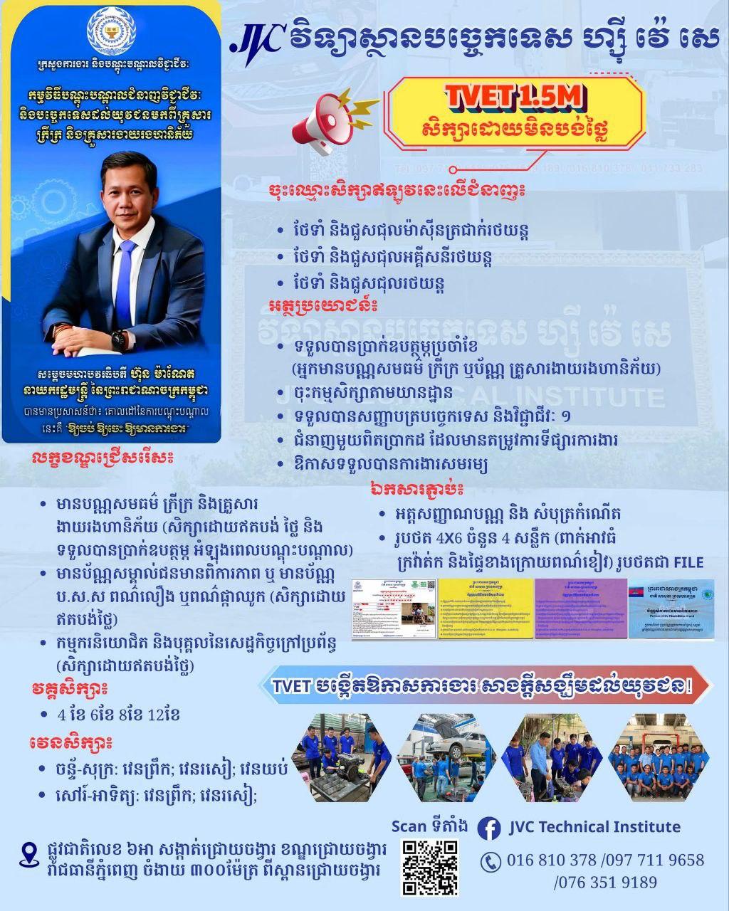 (ភ្នំពេញ)៖ វិទ្យាស្ថានបច្ចេកទេស ហ្សុី វ៉េ សេ នៃក្រសួងការងារ និងបណ្តុះបណ្តលវិជ្ជាជីវៈ ផ្តល់អាហារូបករណ៍ចំនួន ៣០០កន្លែង លើ ៣មុខជំនាញ ដល់យុវជនមកពីគ្រួសារក្រីក្រ និងគ្រួសារងាយរងហានិភ័យ ព្រមទាំងផ្ដល់ប្រាក់ឧបត្ថម្ភប្រចាំខែក្រោមកម្មវិធីបណ្តុះបណ្តាលជំនាញវិជ្ជាជីវៈ និងបច្ចេកទេសដល់យុវជនមកពីគ្រួសារក្រីក្រ និងគ្រួសារងាយរងហានិភ័យ (TVET 1.5M)។ សម្រាប់ប្រជាពលរដ្ឋ និងយុវជន ដែលមិនមែនជាក្រុមគោលដៅ ក៏អាចស្នើចុះឈ្មោះចូលសិក្សាបានដោយឥតគិតថ្លៃផងដែរ ប៉ុន្តែមិនទទួលបានប្រាក់ឧបត្ថម្ភនោះឡើយ។
