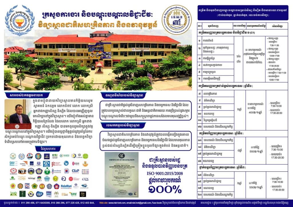 (ភ្នំពេញ)៖ វិទ្យាស្ថានជាតិសហគ្រិនភាព និងនវានុវត្តន៍ នៃក្រសួងការងារ និងបណ្តុះបណ្តលវិជ្ជាជីវៈ ផ្តល់អាហារូបករណ៍ចំនួន ៤ ៥០០កន្លែង លើ ៦មុខជំនាញ ដល់យុវជនមកពីគ្រួសារក្រីក្រ និងគ្រួសារងាយរងហានិភ័យ ព្រមទាំងផ្ដល់ប្រាក់ឧបត្ថម្ភប្រចាំខែក្រោមកម្មវិធីបណ្តុះបណ្តាលជំនាញវិជ្ជាជីវៈ និងបច្ចេកទេសដល់យុវជនមកពីគ្រួសារក្រីក្រ និងគ្រួសារងាយរងហានិភ័យ (TVET 1.5M)។ សម្រាប់ប្រជាពលរដ្ឋ និងយុវជន ដែលមិនមែនជាក្រុមគោលដៅ ក៏អាចស្នើចុះឈ្មោះចូលសិក្សាបានដោយឥតគិតថ្លៃផងដែរ ប៉ុន្តែមិនទទួលបានប្រាក់ឧបត្ថម្ភនោះឡើយ។