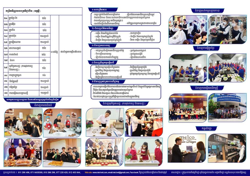 មុខជំនាញទាំង៦នោះ រួមមាន ការផលិតនំ, ធុរកិច្ចភេសជ្ជៈ (ការឆុងកាហ្វេ និងភេសជ្ជៈ), ការធ្វើម្ហូបខ្មែរ, សេវាកម្មសម្អាងកាយ, ការក្រឡុកស្រា, និងការបង្កើតអាជីវកម្ម និងសហគ្រិនភាព។