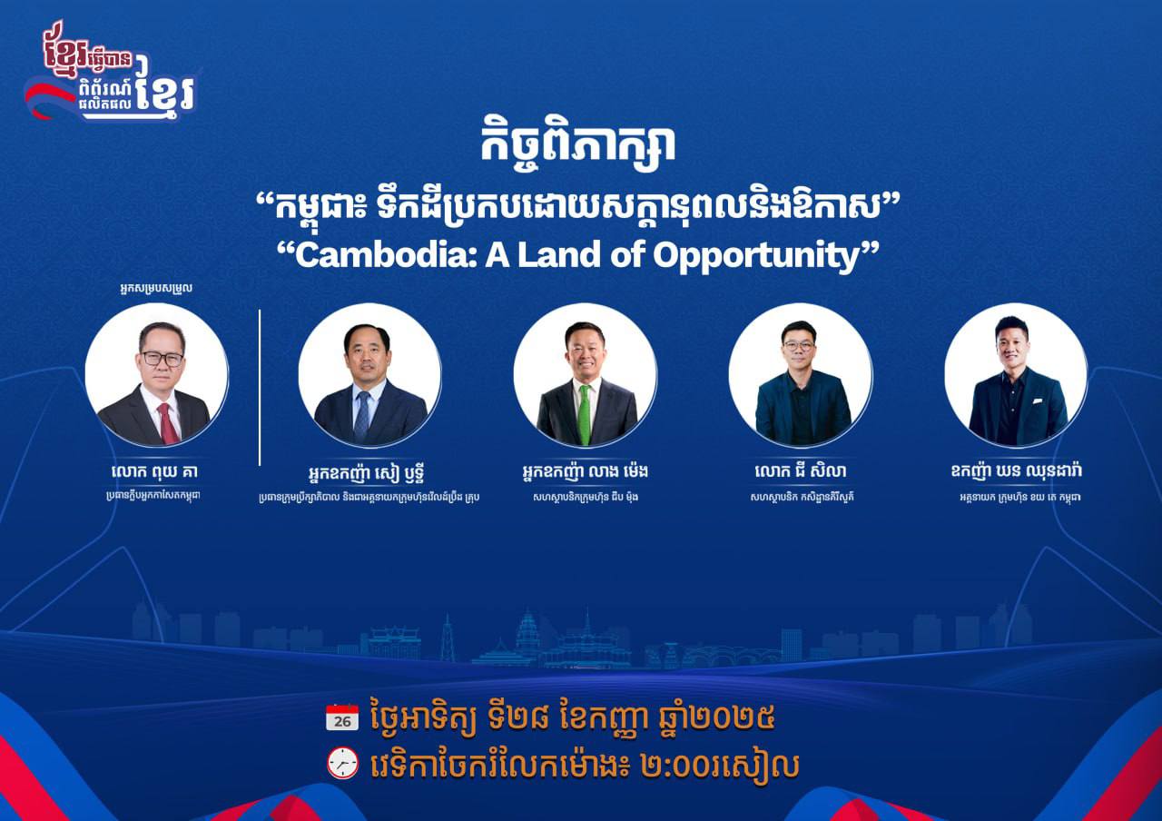 (ភ្នំពេញ)៖ វេទិកា «ទឹកដីប្រកបដោយសក្ដានុពល និងឱកាស» គឺជាប្រធានបទមួយសំខាន់នៃ កម្មវិធីពិព័រណ៍ផលិតផលខ្មែរ ក្រោមប្រធានបទ «ខ្មែរធ្វើបាន៖ ចូលរួម ជំរុញ និងគាំទ្រ ផលិតផលខ្មែរ» ដែលនឹងប្រព្រឹត្តទៅនៅថ្ងៃទី២៨ ខែកញ្ញា ឆ្នាំ២០២៥នេះ សាលពិព័រណ៍កោះពេជ្រ ។