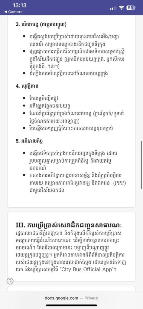 ដើម្បីធានាដល់ផែនការនេះពិតជាបានឆ្លុះបញ្ចាំងពីតម្រូវការ និងទស្សនៈចម្រុះរបស់អ្នកប្រើប្រាស់ដឹកជញ្ជូនក្នុងទីក្រុង ក្រុមអ្នកជំនាញការនៃគម្រោងកំពុងធ្វើការសម្ភាសន៍ជាមួយអ្នកពាក់ព័ន្ធផ្សេងៗ។ ការយល់ឃើញ និងយោបល់របស់លោកអ្នកពិតជាមានសារៈសំខាន់ណាស់ ក្នុងការចូលរួមការរៀបចំយុទ្ធសាស្ត្រដឹកជញ្ជូនក្នុងទីក្រុងប្រកបដោយបរិយាបន្ន និងមានប្រសិទ្ធភាពជាងមុនសម្រាប់អនាគតរបស់រាជធានីភ្នំពេញ៕