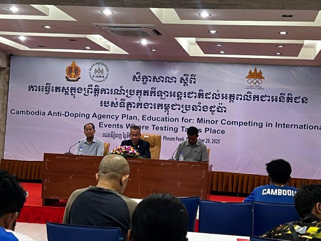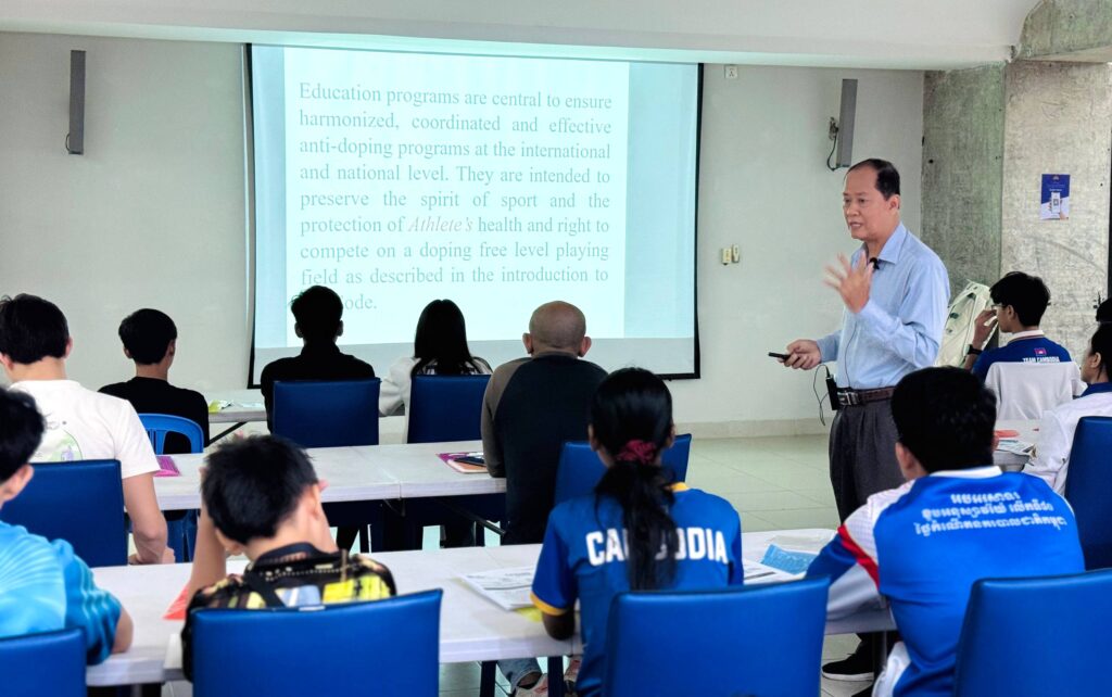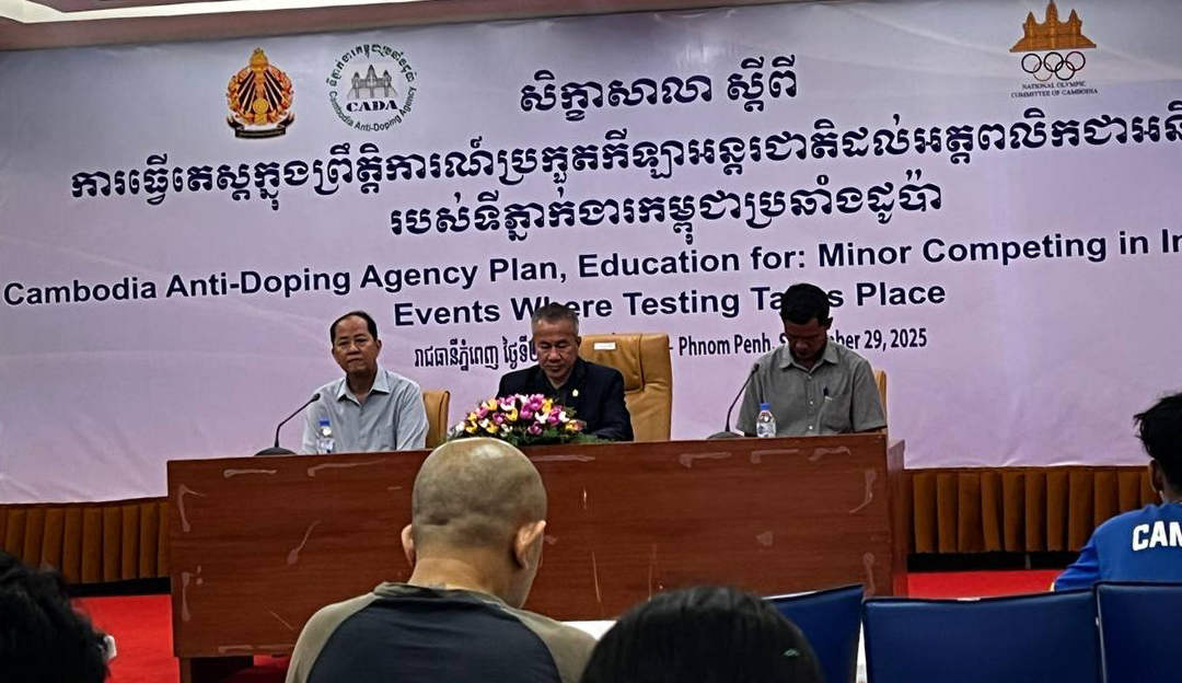 ការគូសបញ្ជាក់ របស់ រដ្ឋលេខាធិការក្រសួងអប់រំយុវជននិងកីឡា ឯកឧត្តម វ៉ាត់ ចំរើន ក្នុងសិក្ខាសាលា ស្តីពីការធ្វើតេស្តក្នុងព្រឹត្តិការណ៍កីឡាប្រកួតអន្តរជាតិដល់អត្តពលជាអនិតិជនរបស់ទីភ្នាក់ងារប្រឆាំងសារធាតុដូប៉ាកម្ពុជានៅអាគារគណៈកម្មាធិការជាតិអូឡាំពិកកម្ពុជា នាព្រឹកថ្ងៃទី២៩ ខែ កញ្ញា ឆ្នាំ២០២៥។